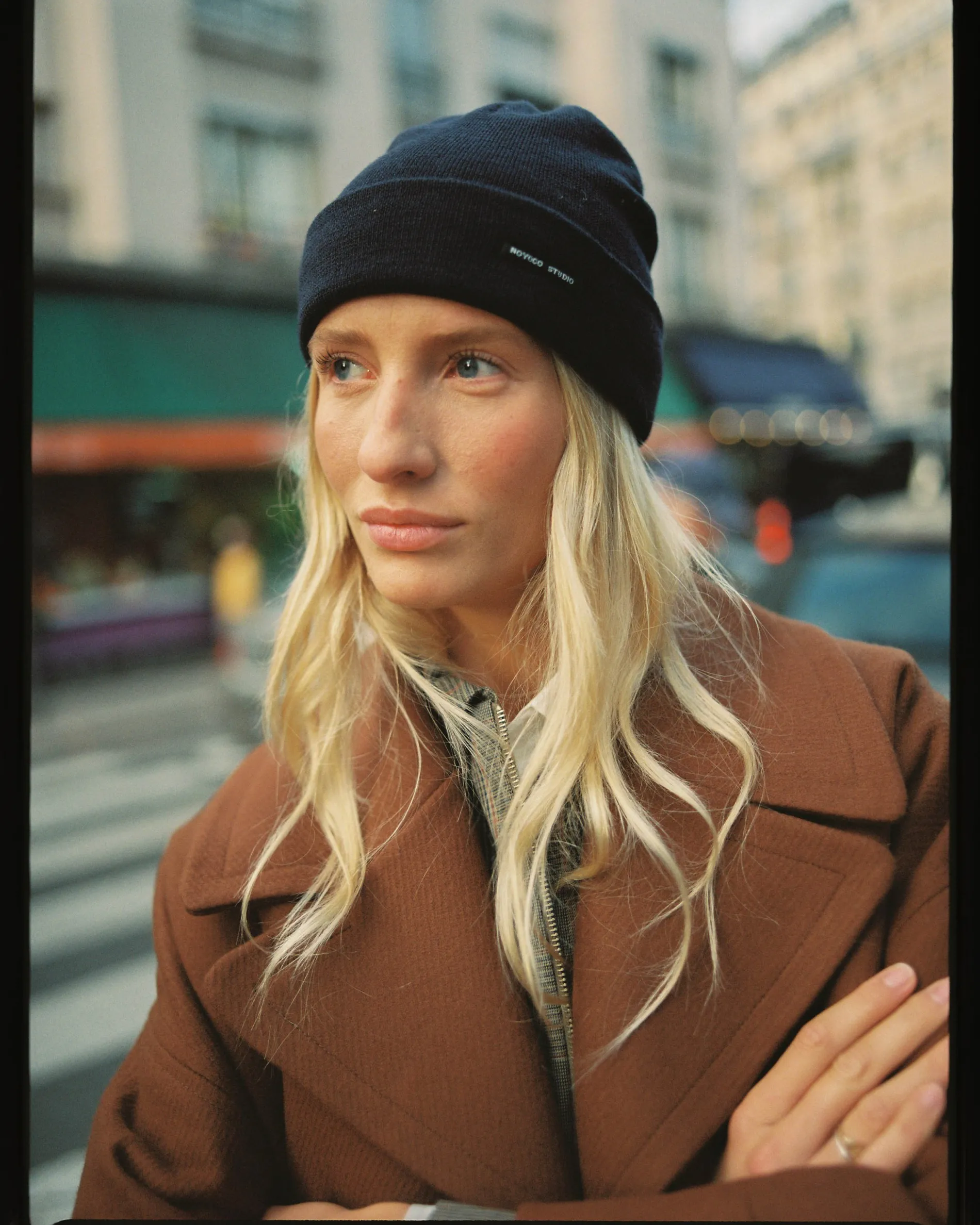 Le bonnet unisexe noyoco en laine mérinos avec revers et label « noyoco studio » brodé sur le côté avant. Chaque pièce du vestiaire noyoco est fabriquée en Europe, de la matière au vêtement.