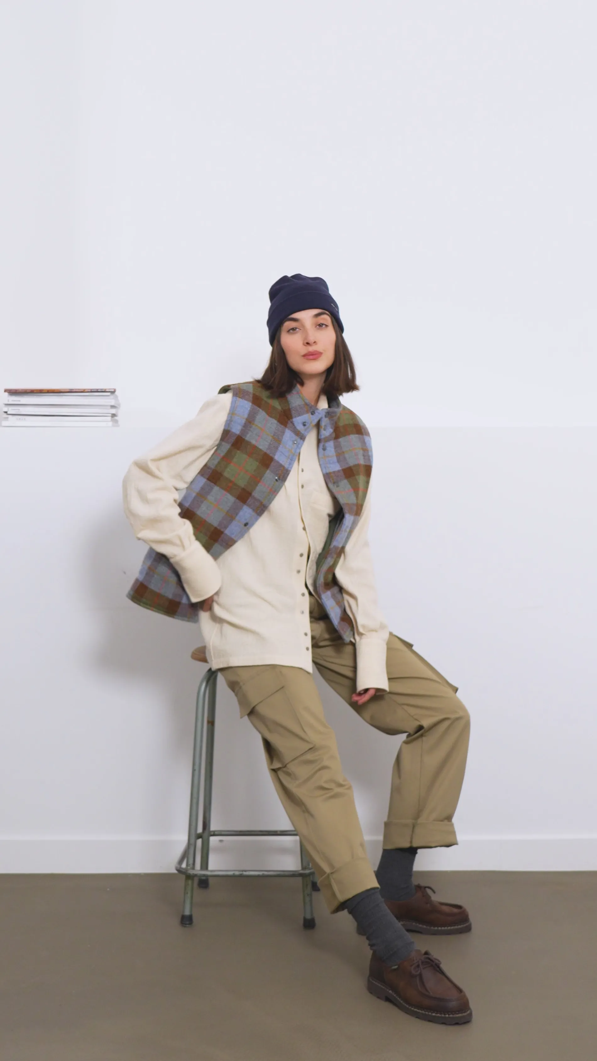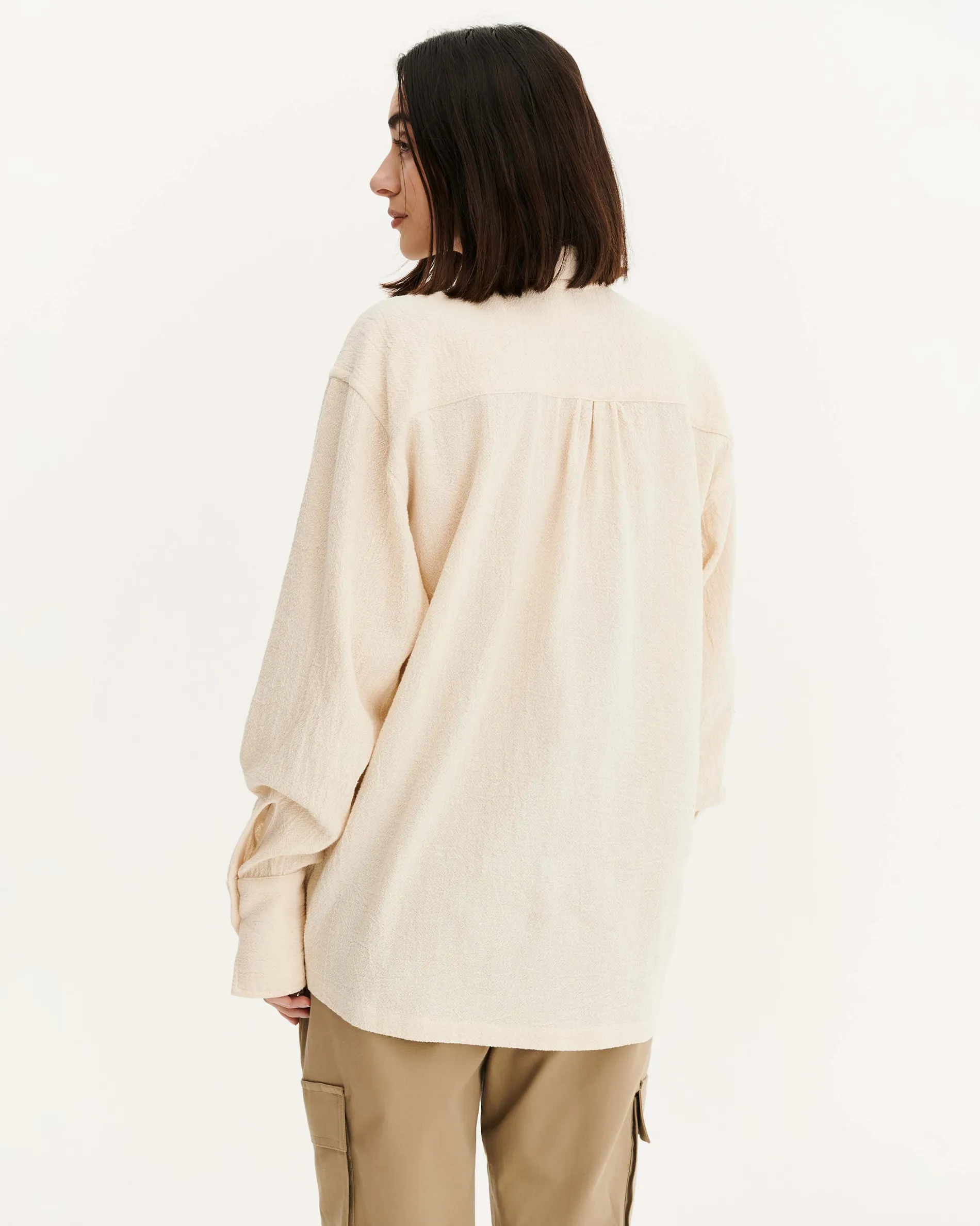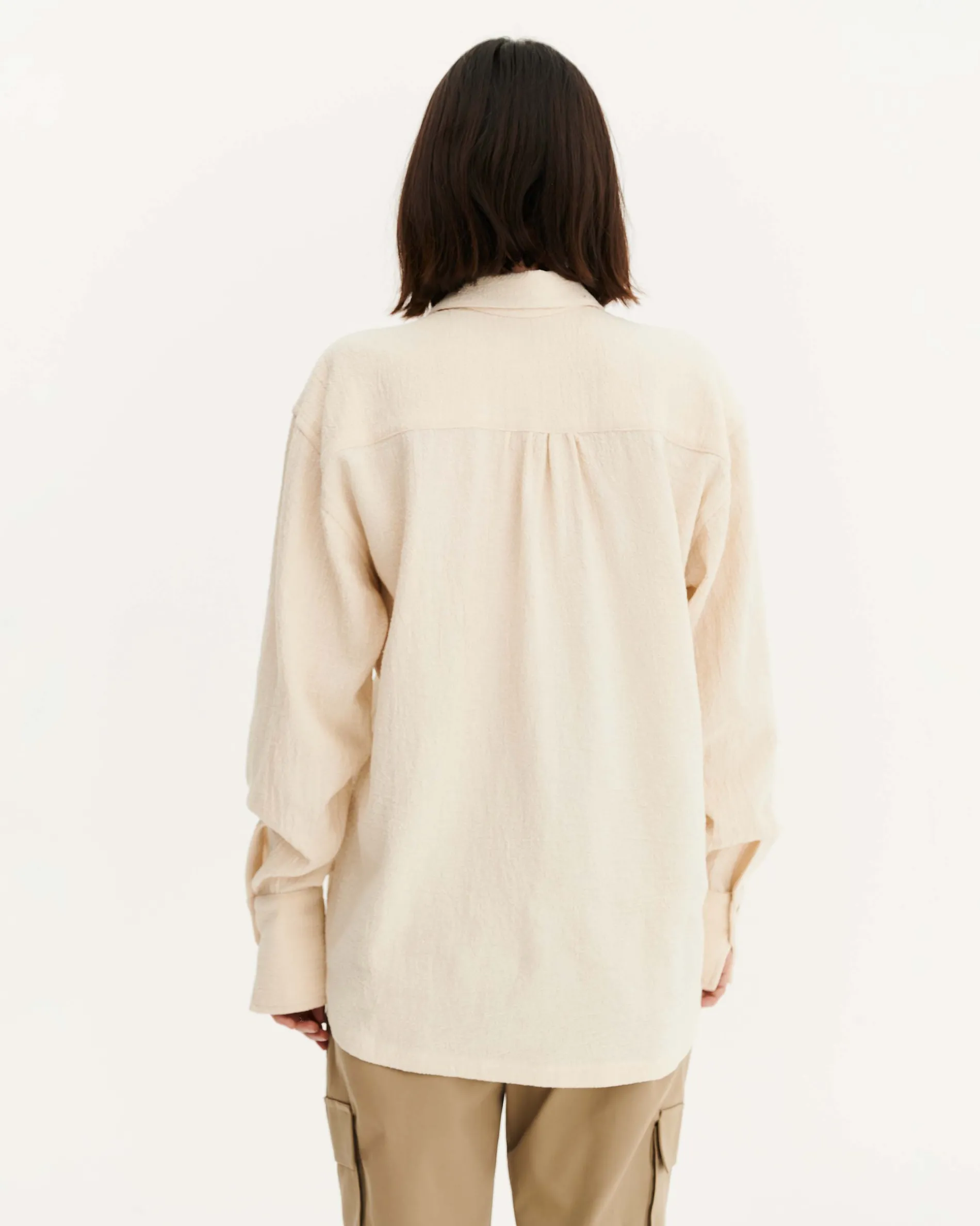 La chemise pour femme noyoco confectionnée en coton biologique. Coupe ample élégante, base asymétrique, épaule tombante et plissée.Col français. Poche plaquée à la poitrine, manches boutonnées et pattes capucin longues. Boutons par duo fabriqués en bio-résine. Chaque pièce du vestiaire noyoco est fabriquée en Europe, de la matière au vêtement.