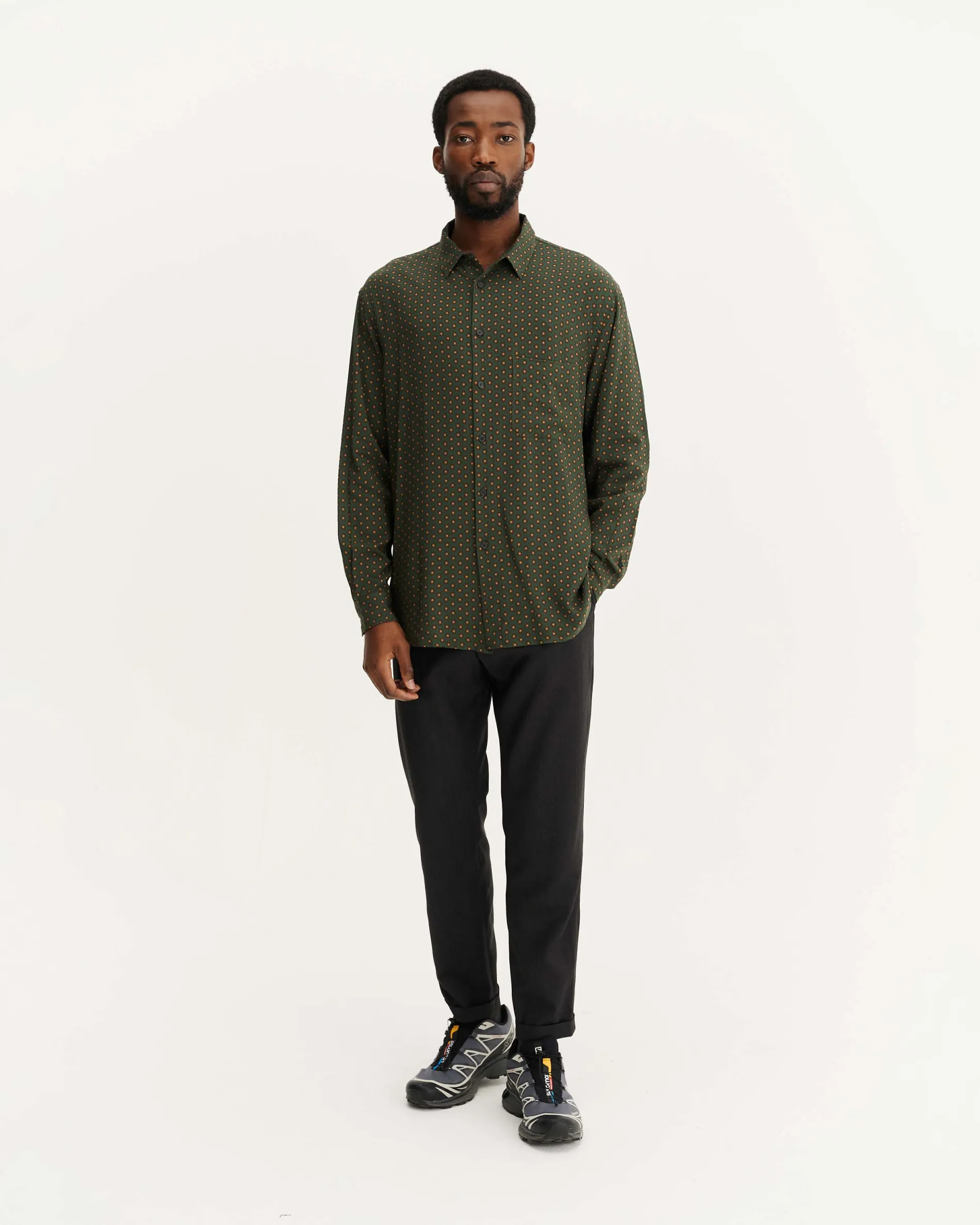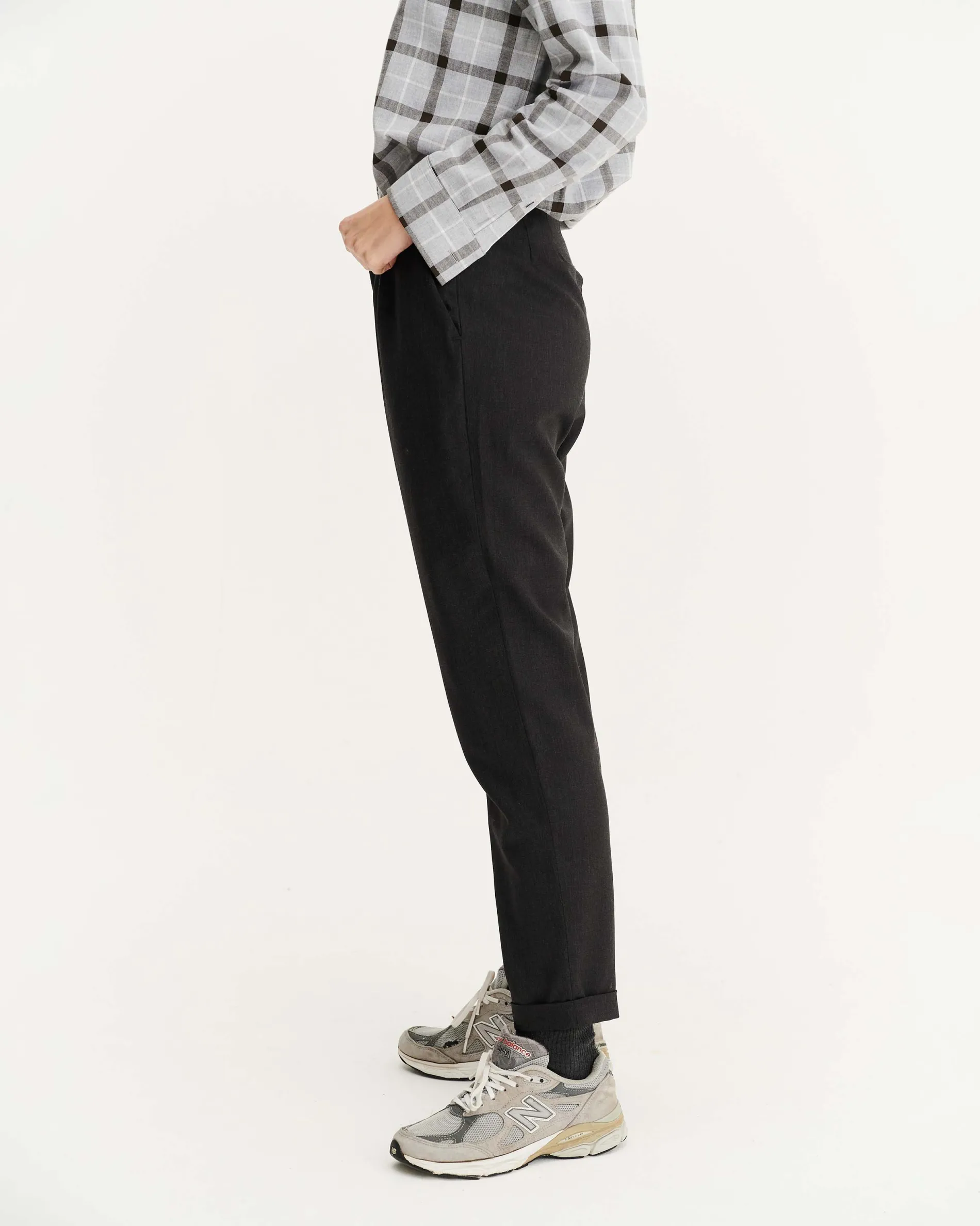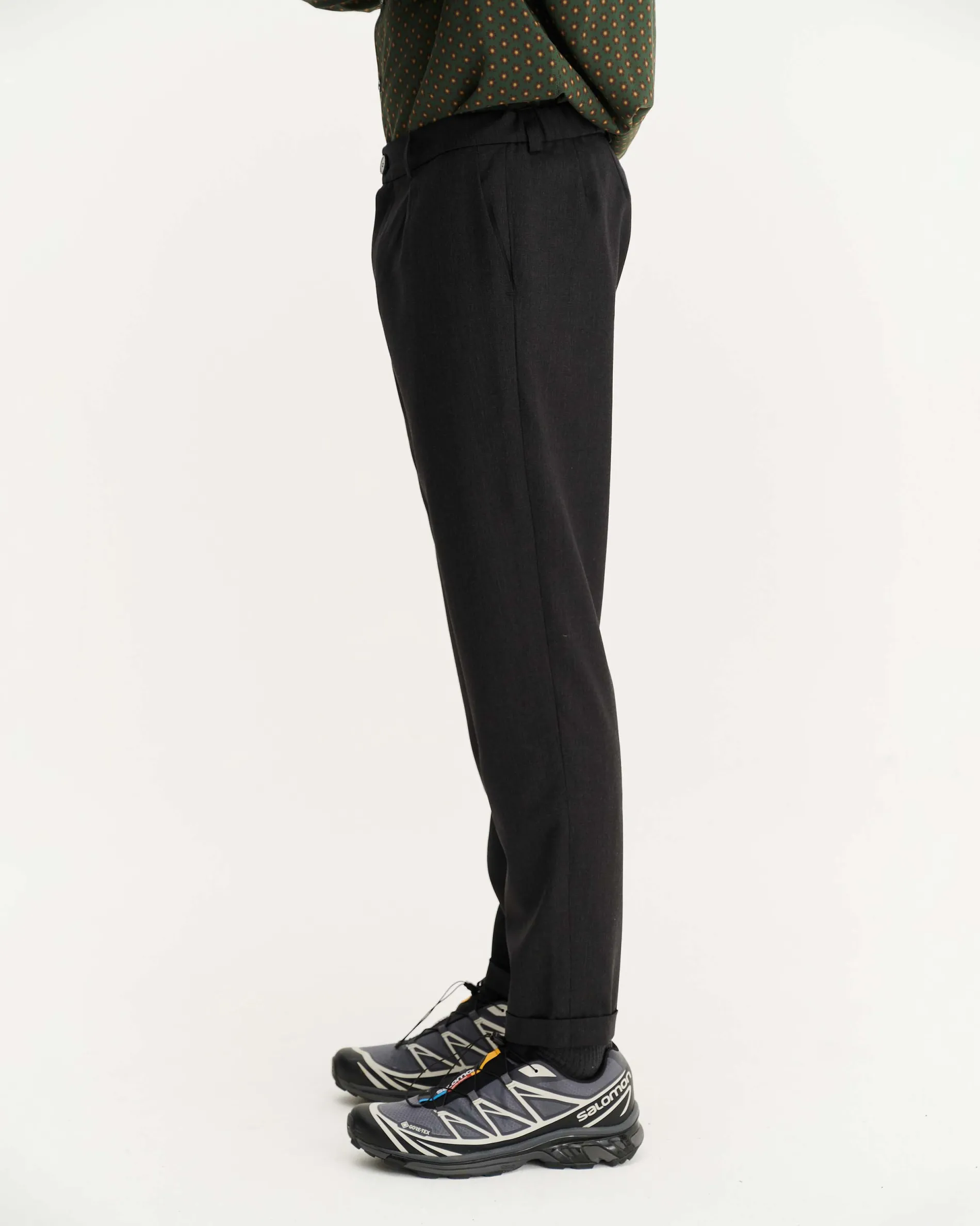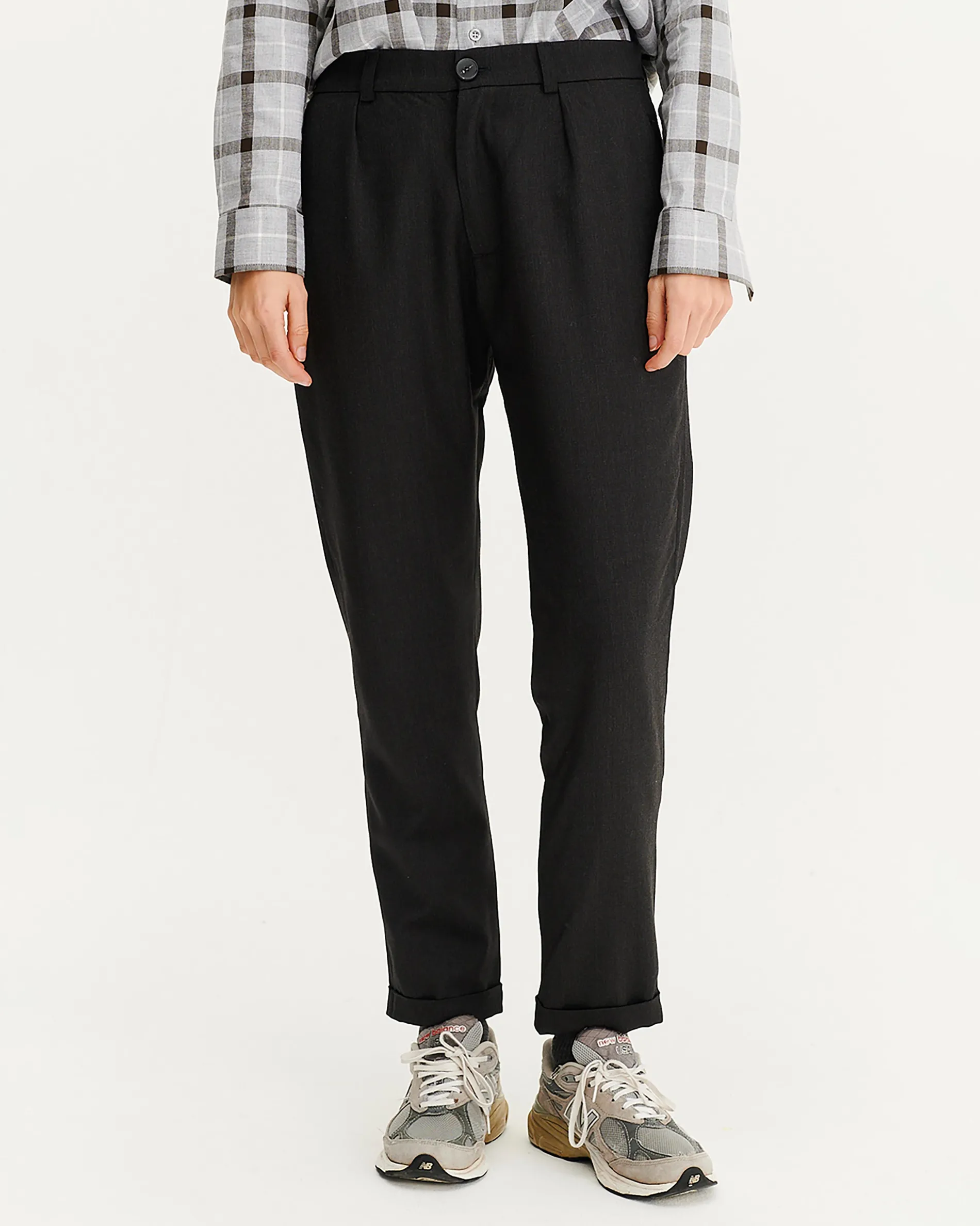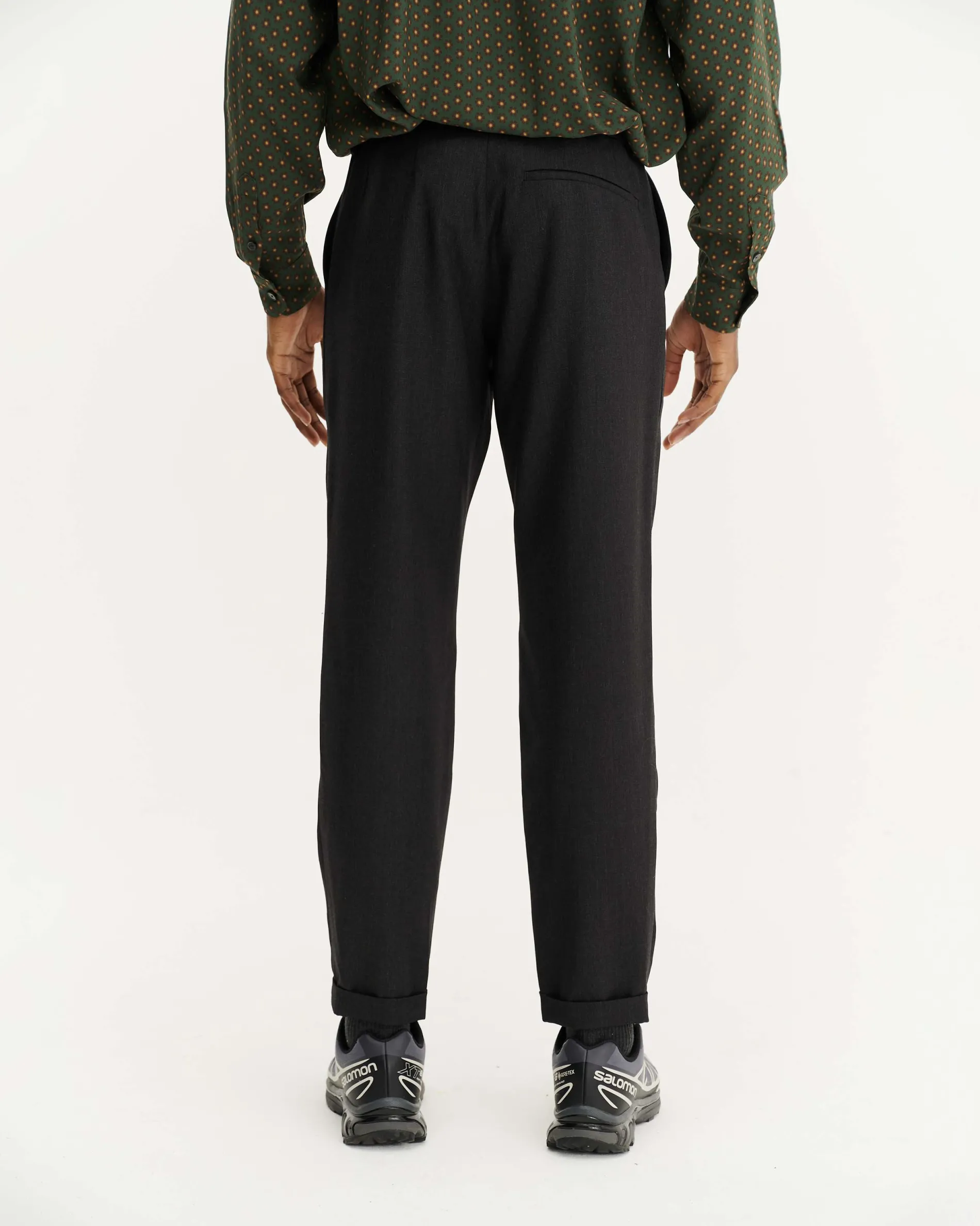 Le pantalon unisexe noyoco à pinces avec une coupe carotte confectionné en laine vierge. Jambe droite aux cuisses et s’ajuste en bas de jambe avec un revers. Taille normale et élastiques sur les côtés. Poches italiennes à l’avant et poches passepoilées dans le dos. Fermeture par bouton et braguette zippée. Chaque pièce du vestiaire noyoco est fabriquée en Europe, de la matière au vêtement.