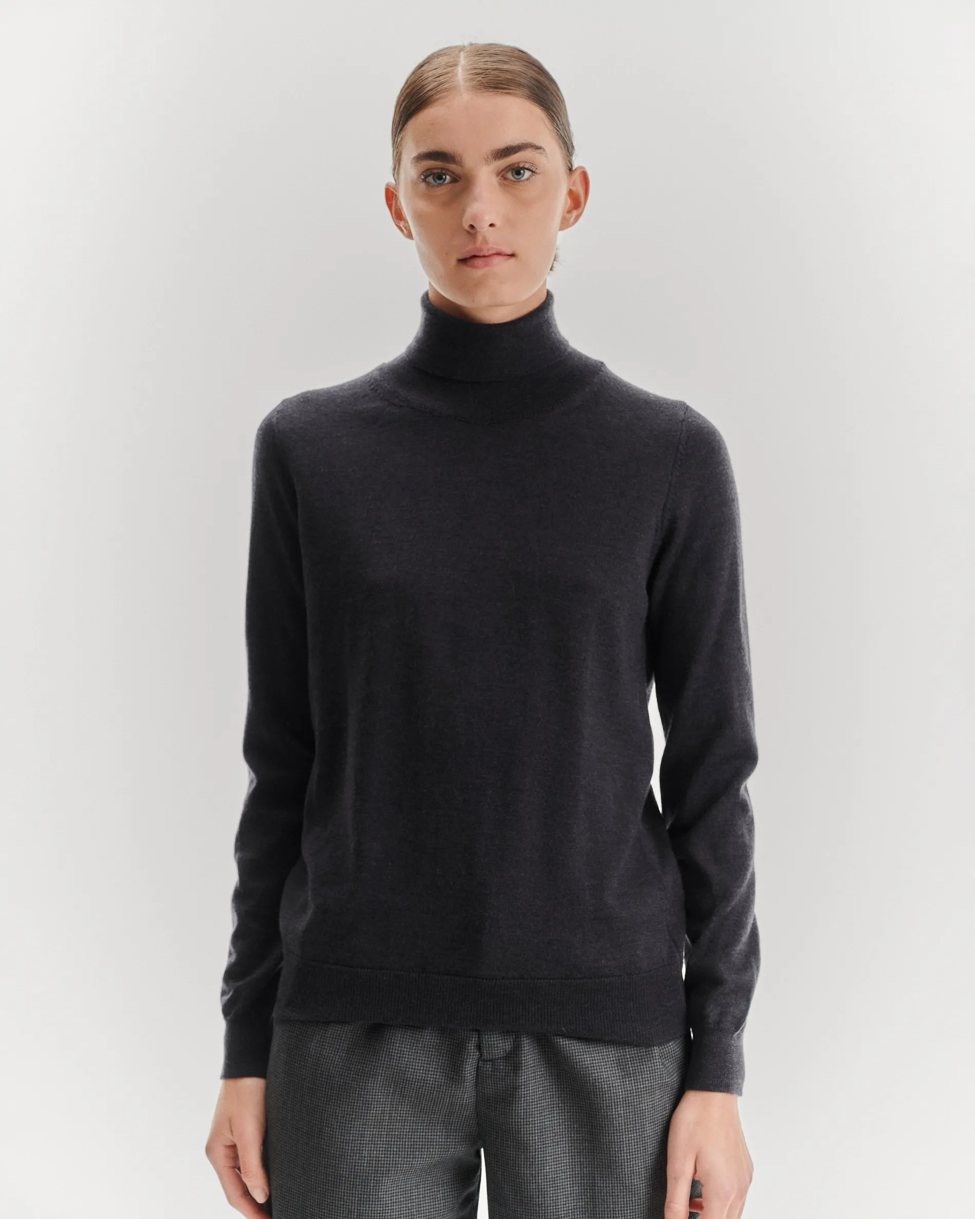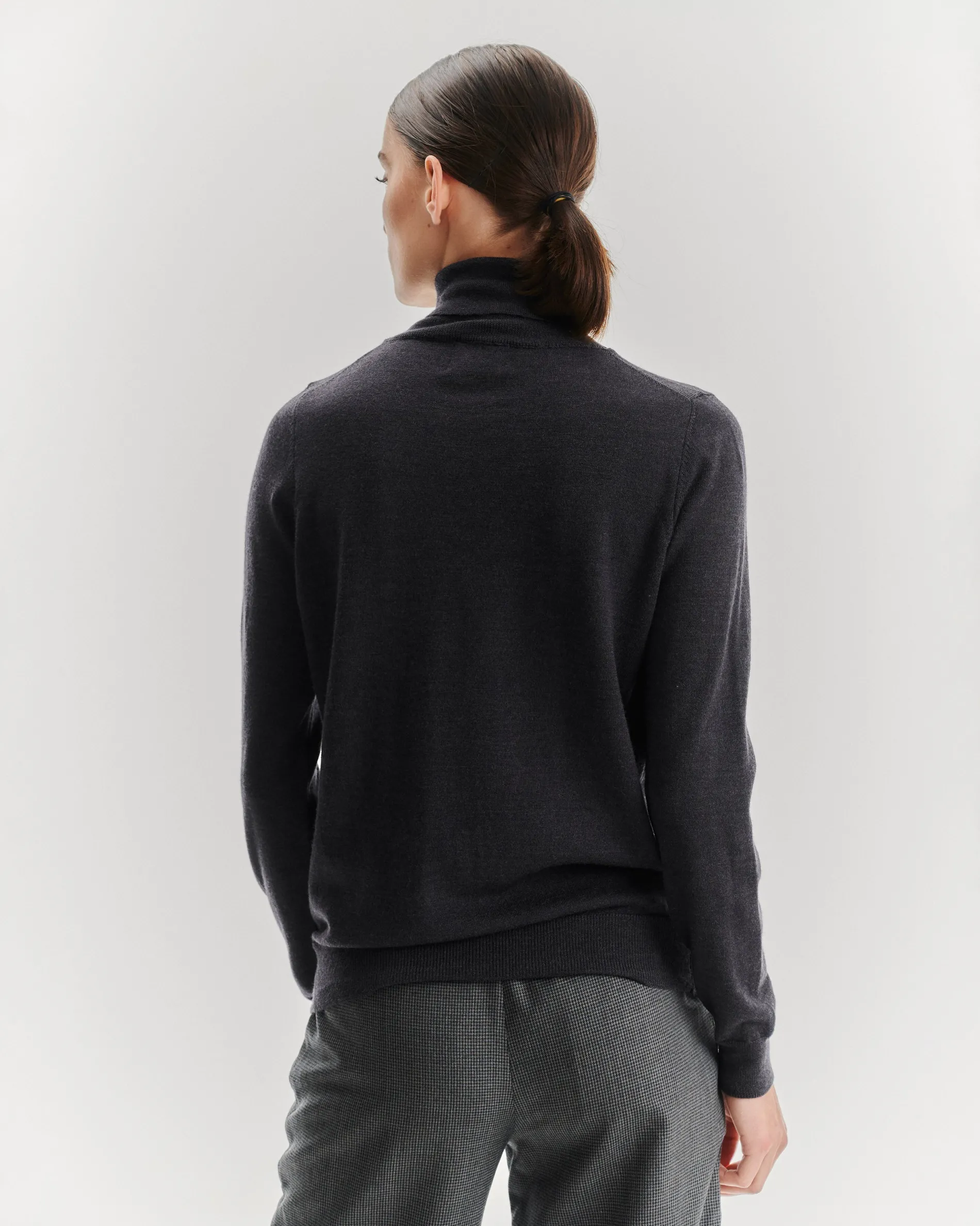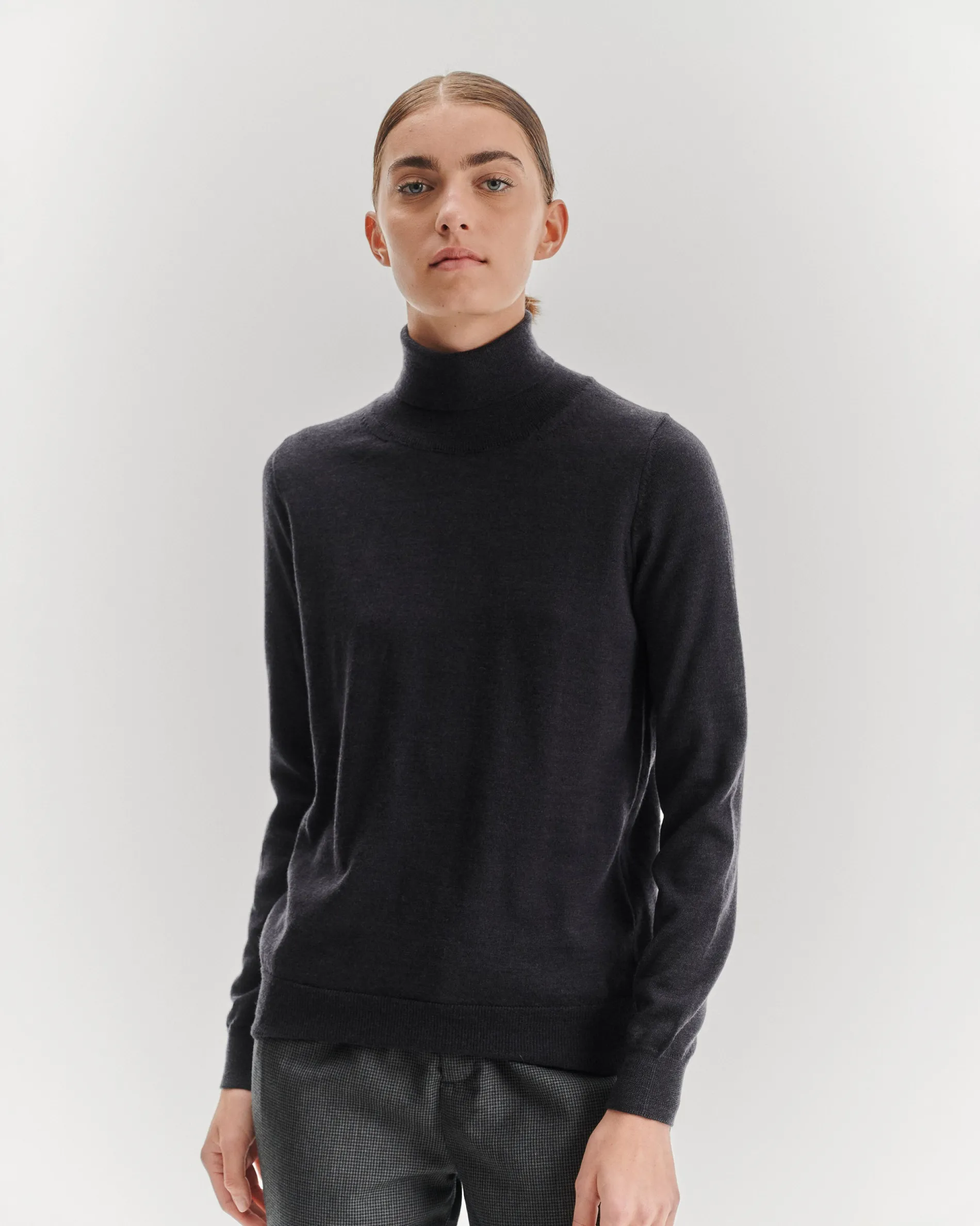 – 100% laine merinos – Col roulé – Encolure et poignets côtelées- Emmanchures basses- Coupe ajustée- Fabriqué dans nos ateliers partenaires en Italie