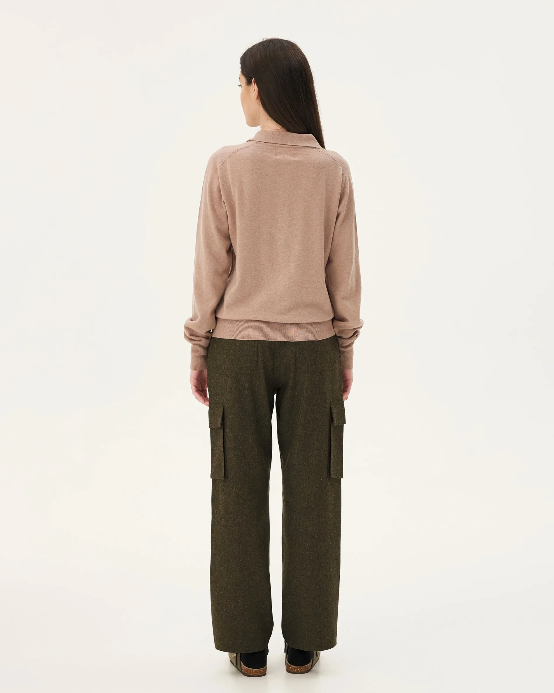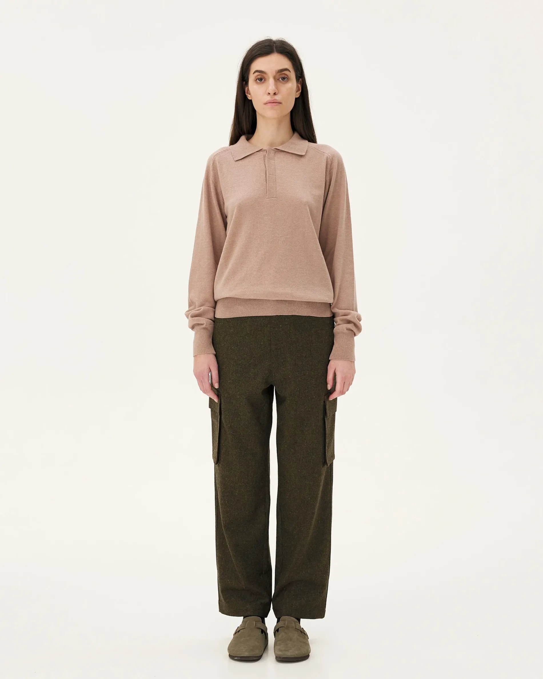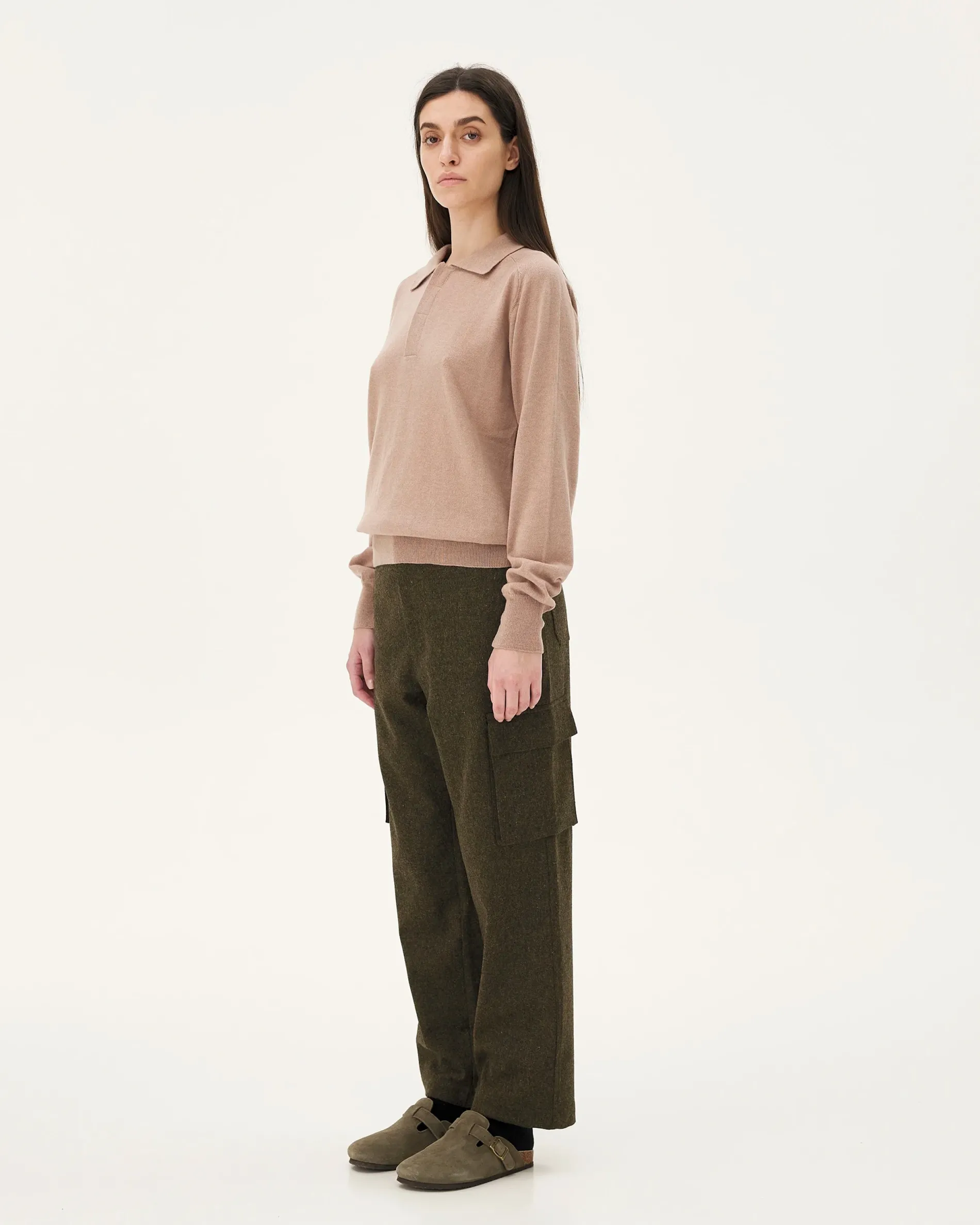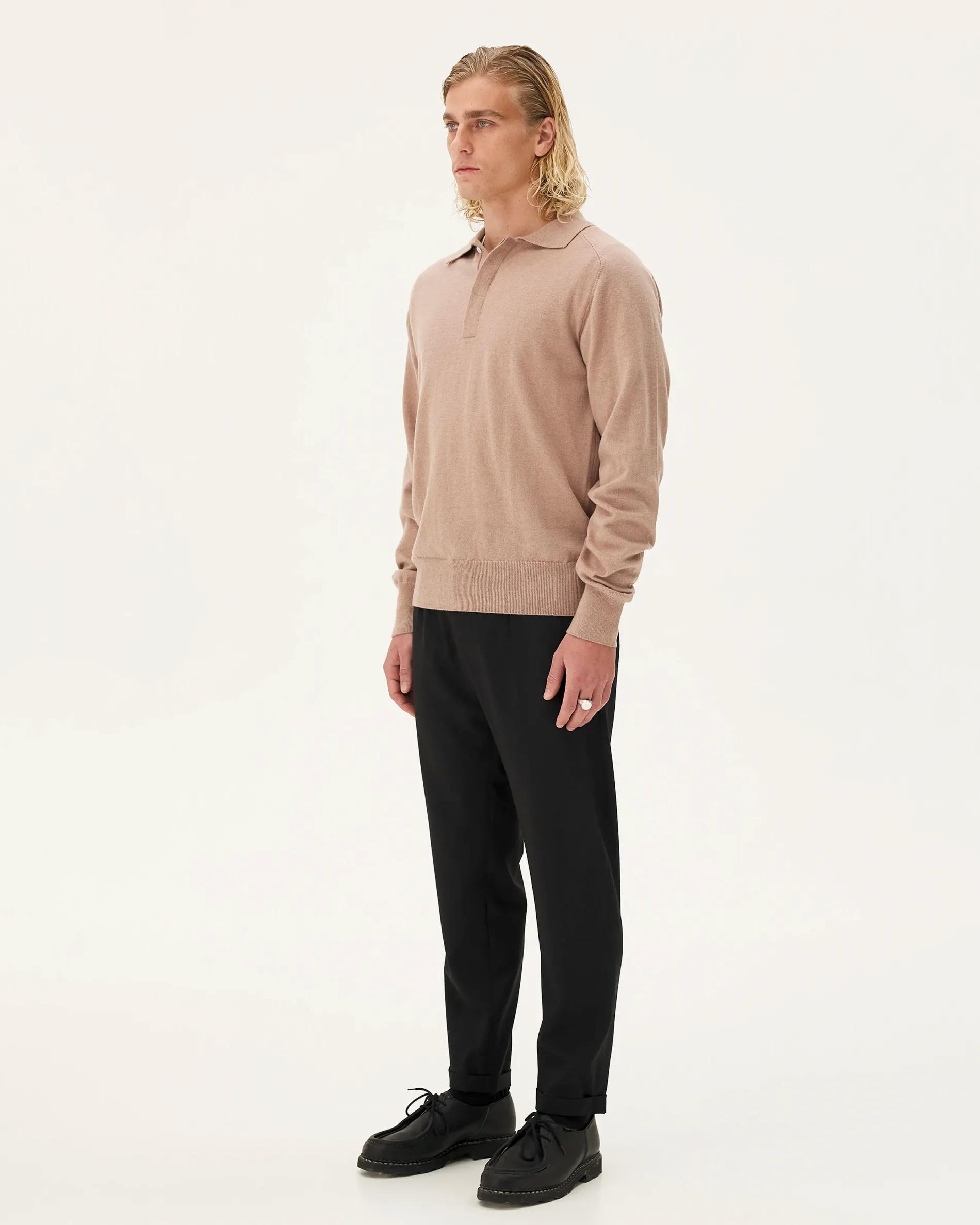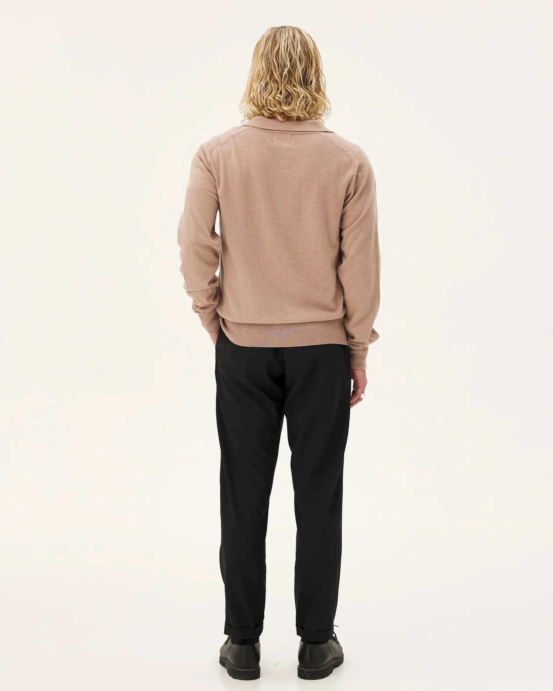 Le polo Hanzo est une pièce classique de la garde-robe unisexe. Il est tricoté dans un luxueux fil de laine mérinos cardé provenant de notre filateur Italien Botto Guiseppe. Il présente une coupe décontractée, une patte de boutonnage invisible ainsi que des finitions côtelées. Il est présenté dans une version beige et noir. Son fil exceptionnel est certifié RWS et cradle to cradle