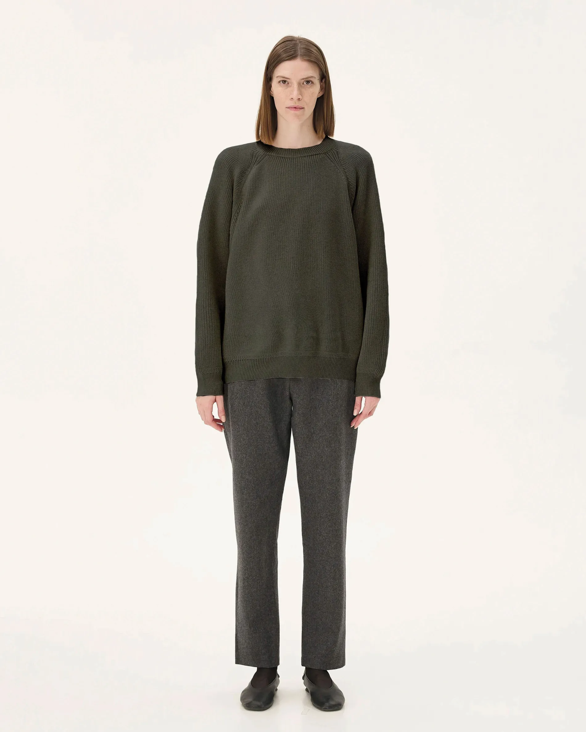 Le pull Oslo est une pièce du vestiaire unisexe. Il est tricoté dans une maille dense, lourde et texturée en côte perlée en laine mérinos et coton biologique. Il est construit avec une manche raglan et un col rond. Au niveau des finitions côtelés il présente également un délicat détail en zigzag.