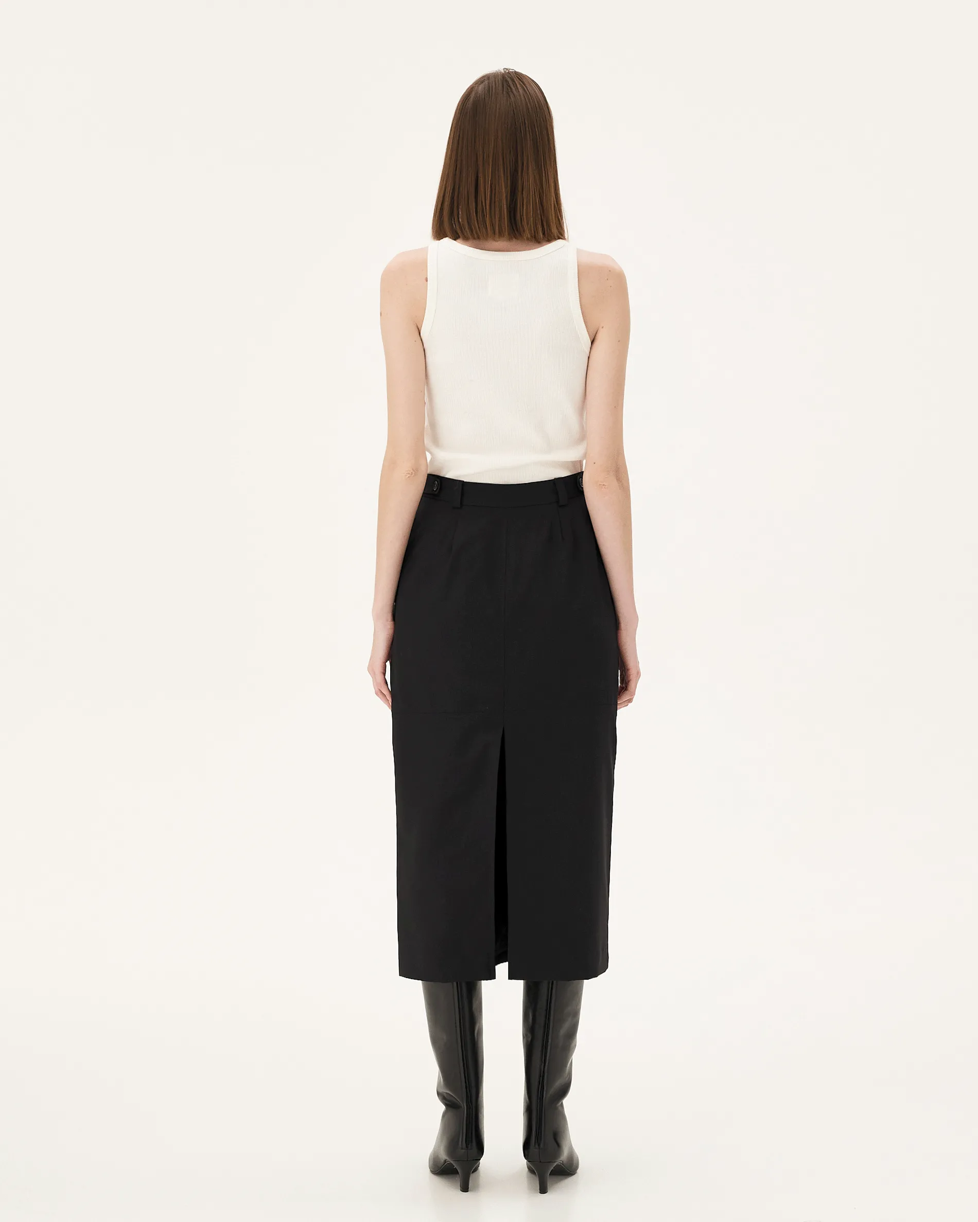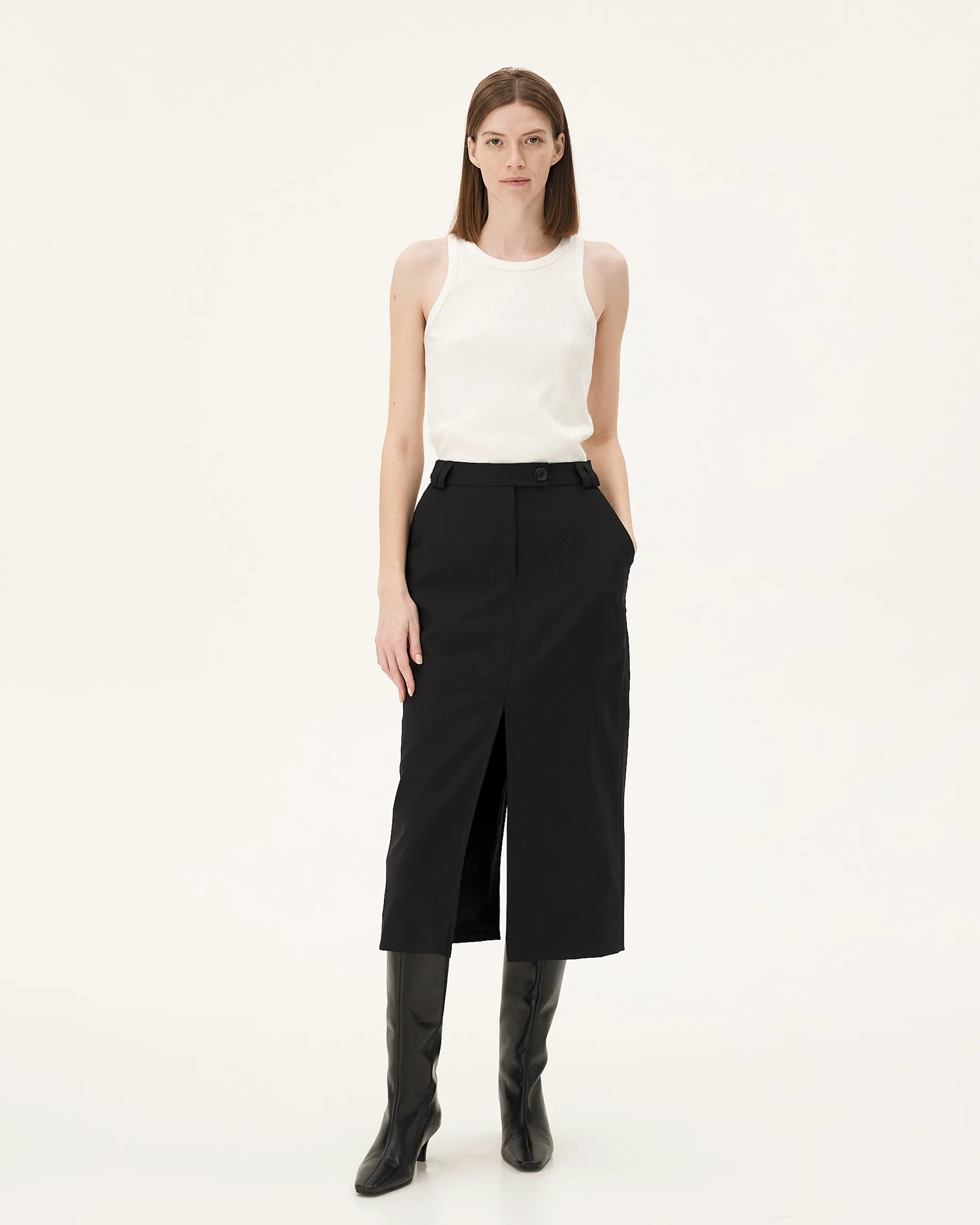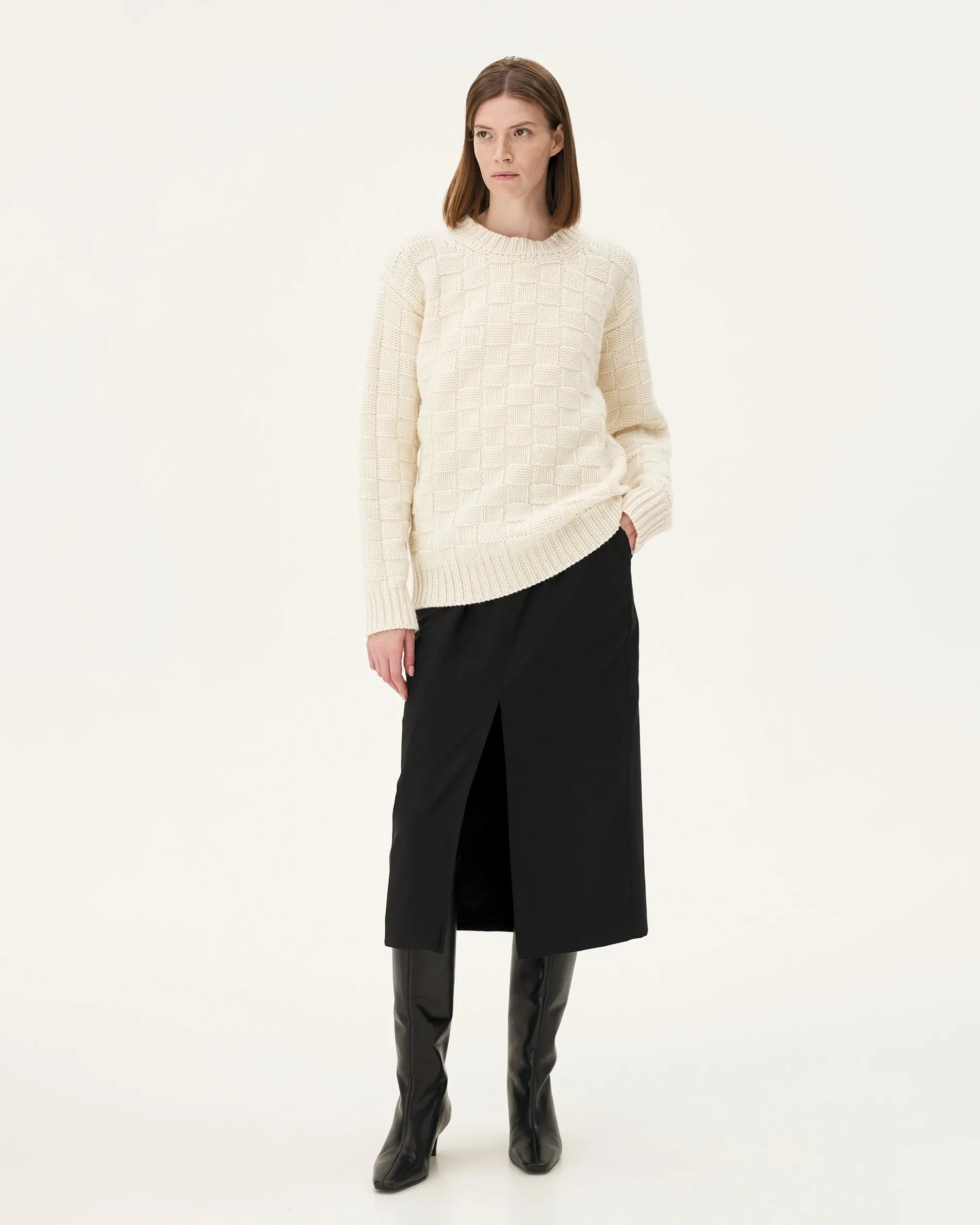 Le jupe Lulea est une jupe mi-longue, fendue devant et dos, confectionnée dans un tissu upcyclé en laine dont la main est douce et souple.