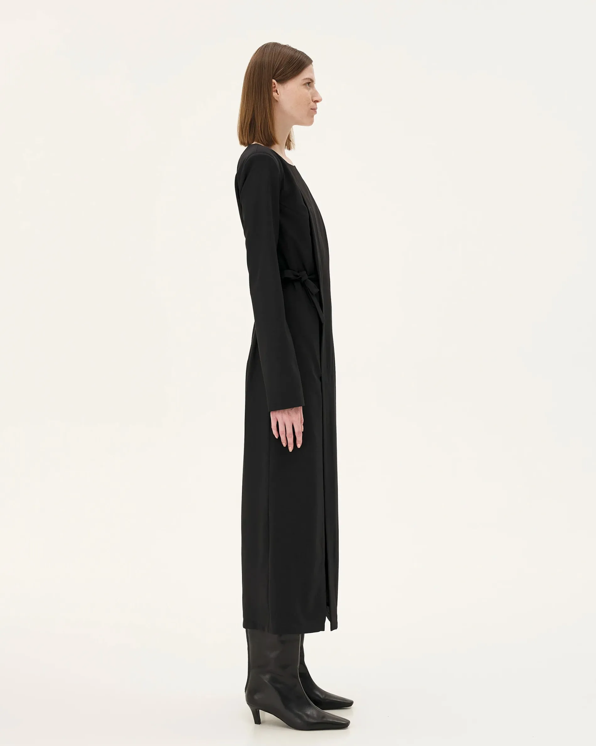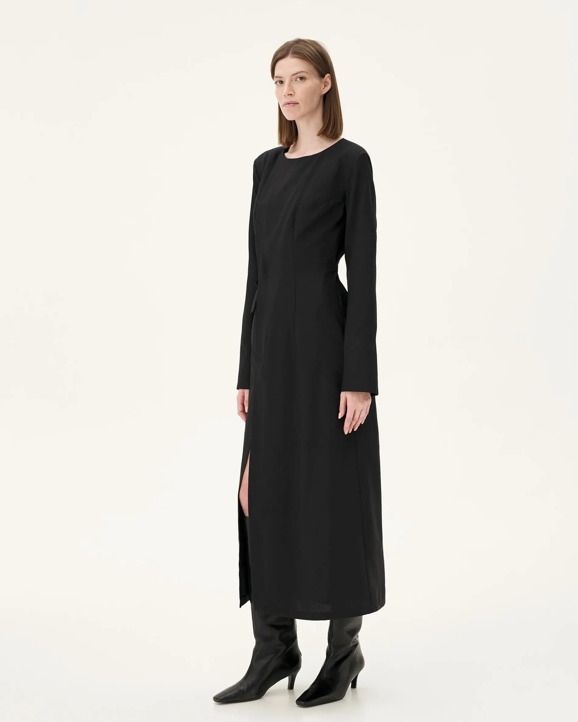 La robe longue Luas est un modèle élégant et sophistiqué à la coupe structurée. Elle est dotée d’une fente d’un côté, d’un lien pour ajuster la taille et de fines épaulettes. Elle est confectionné dans un tissu upcyclé en laine dont la main est douce et souple.
