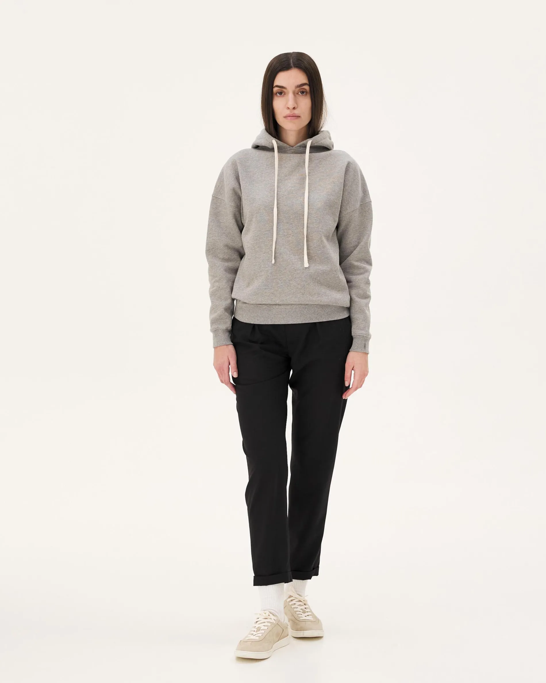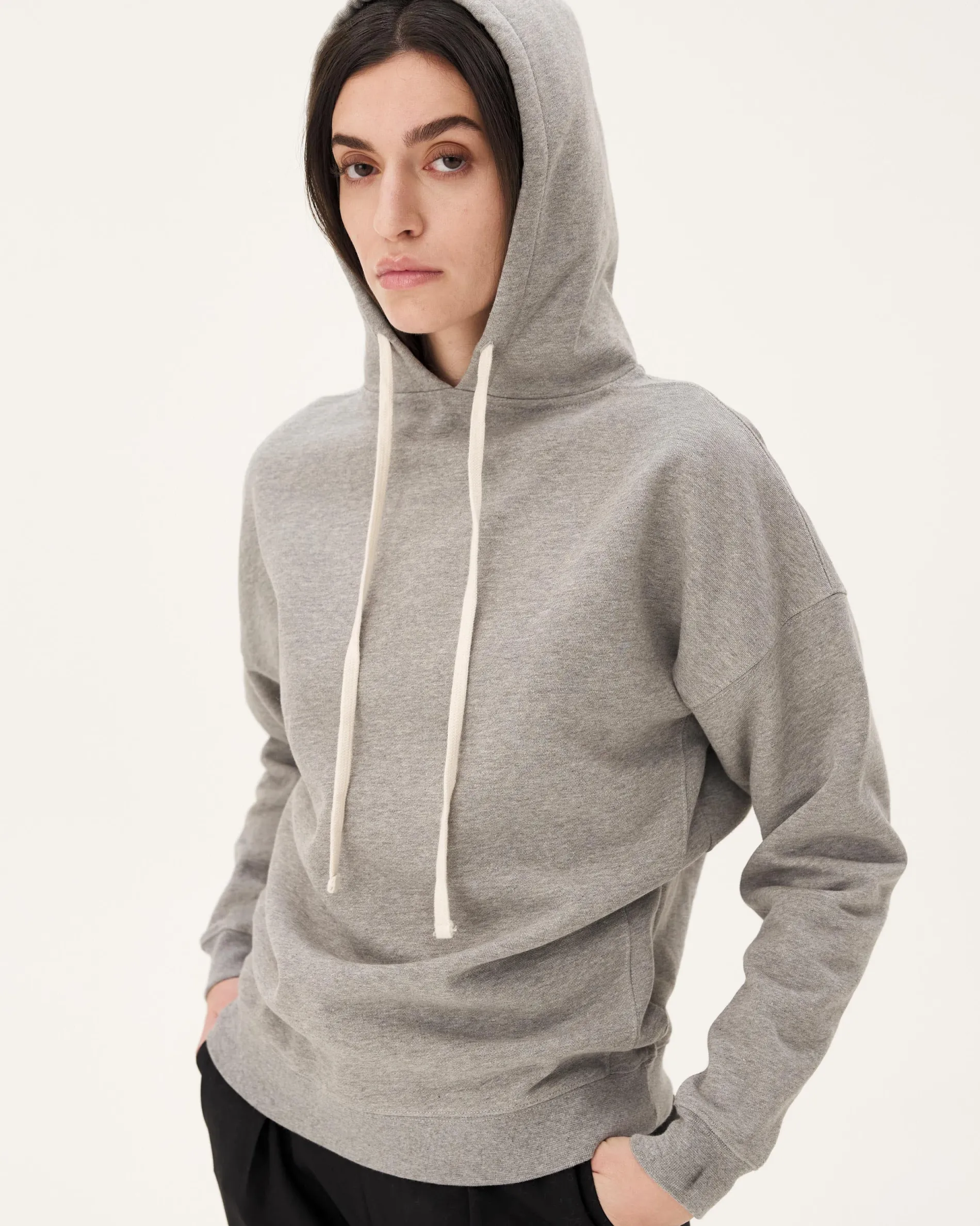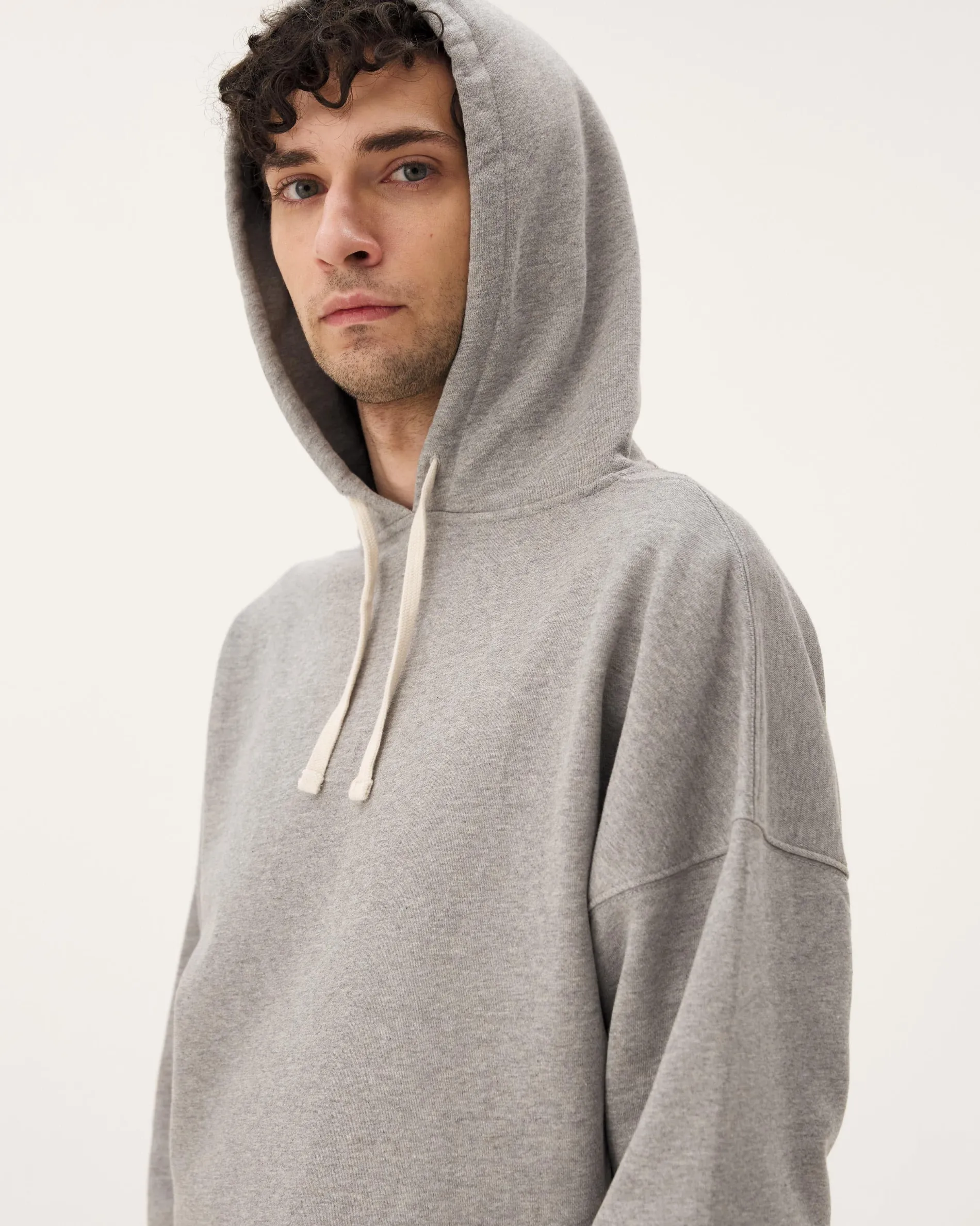 Le hoodie Boston est confectionné dans un jersey légèrement chiné, épais et résistant. La pièce présente un col rond classique, des manches droites ainsi que des finitions côtelées. Il est confectionné en coton biologique de qualité supérieure. Sa structure lisse au toucher est brossé sur l’envers.