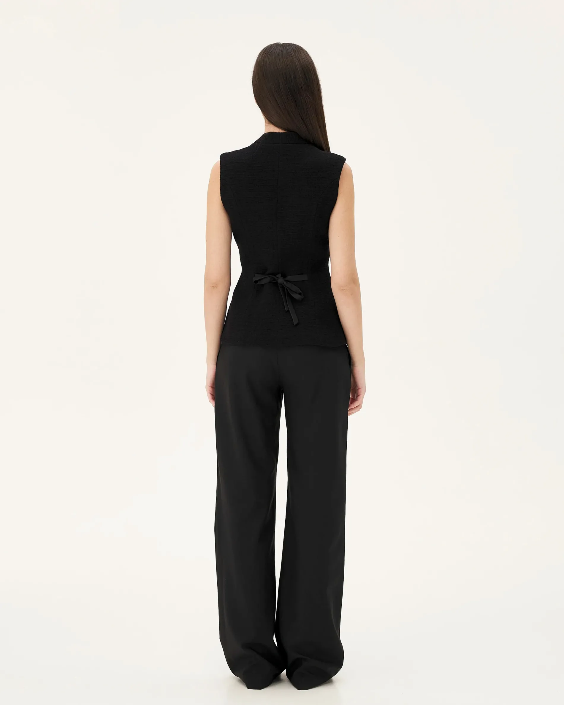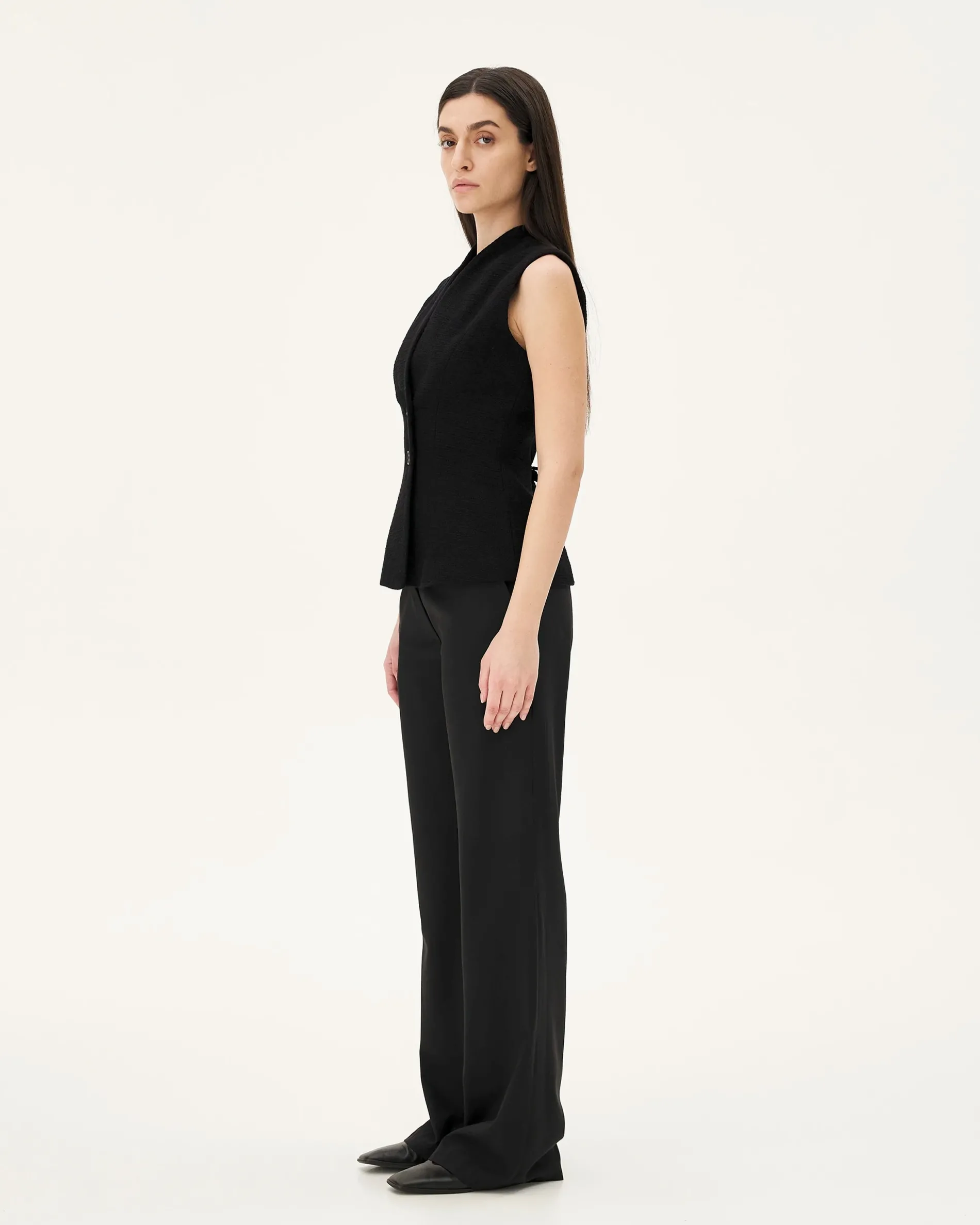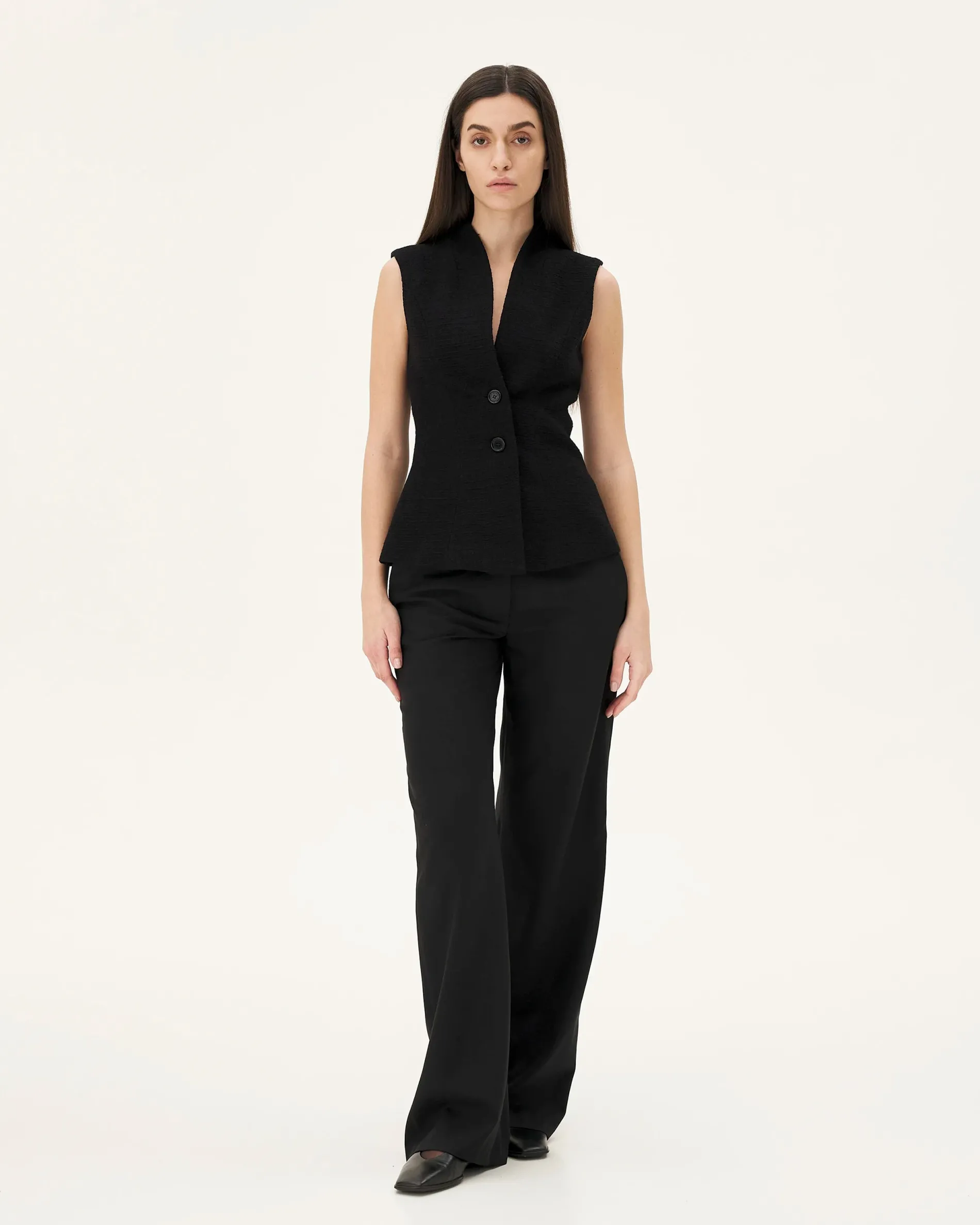 Le gilet Hegra est travaillé comme une pièce de tailleur. Des pinces suivent les courbes du corps et lui confèrent structure et élégance. Il est confectionné dans un tissu upcyclé en coton.