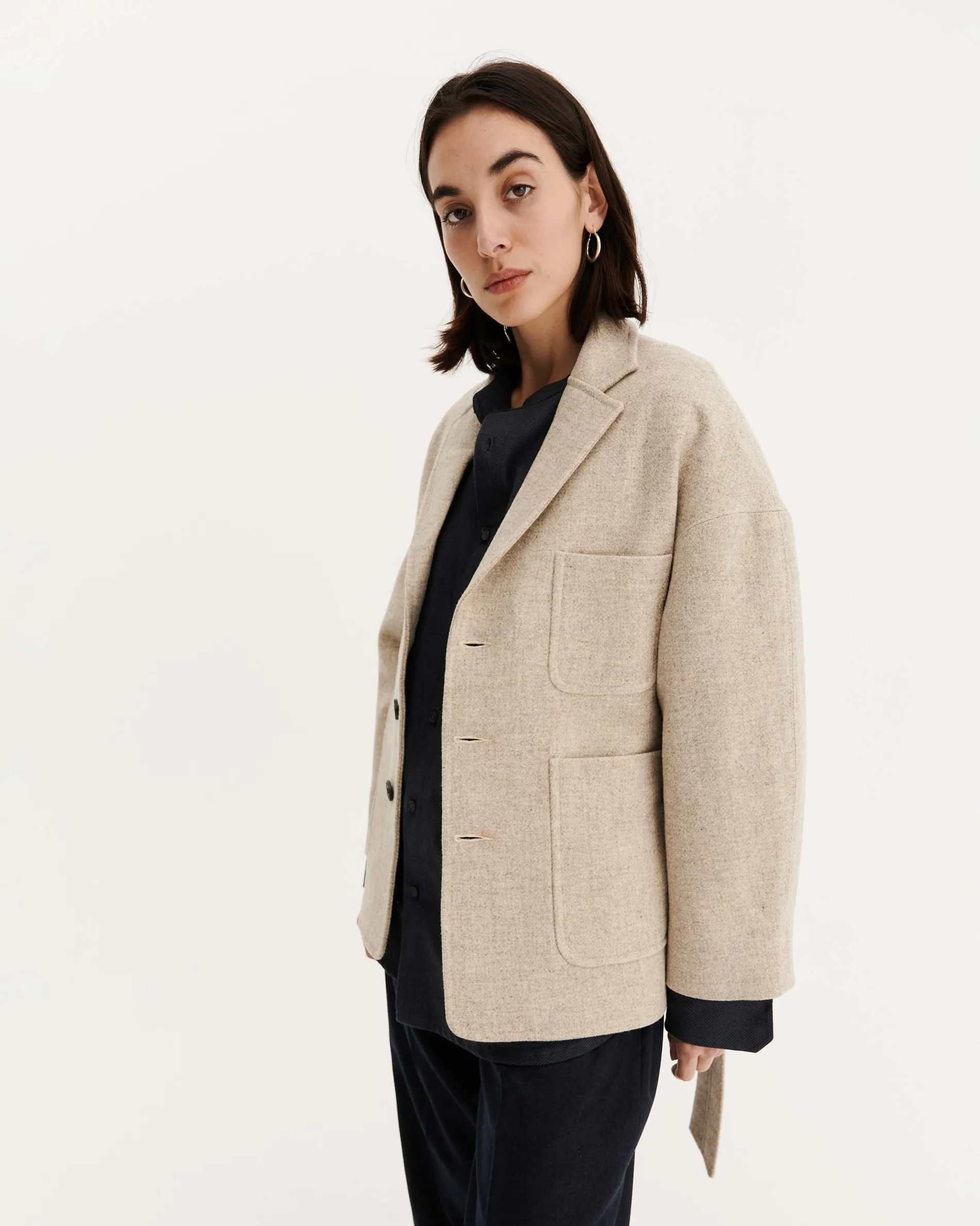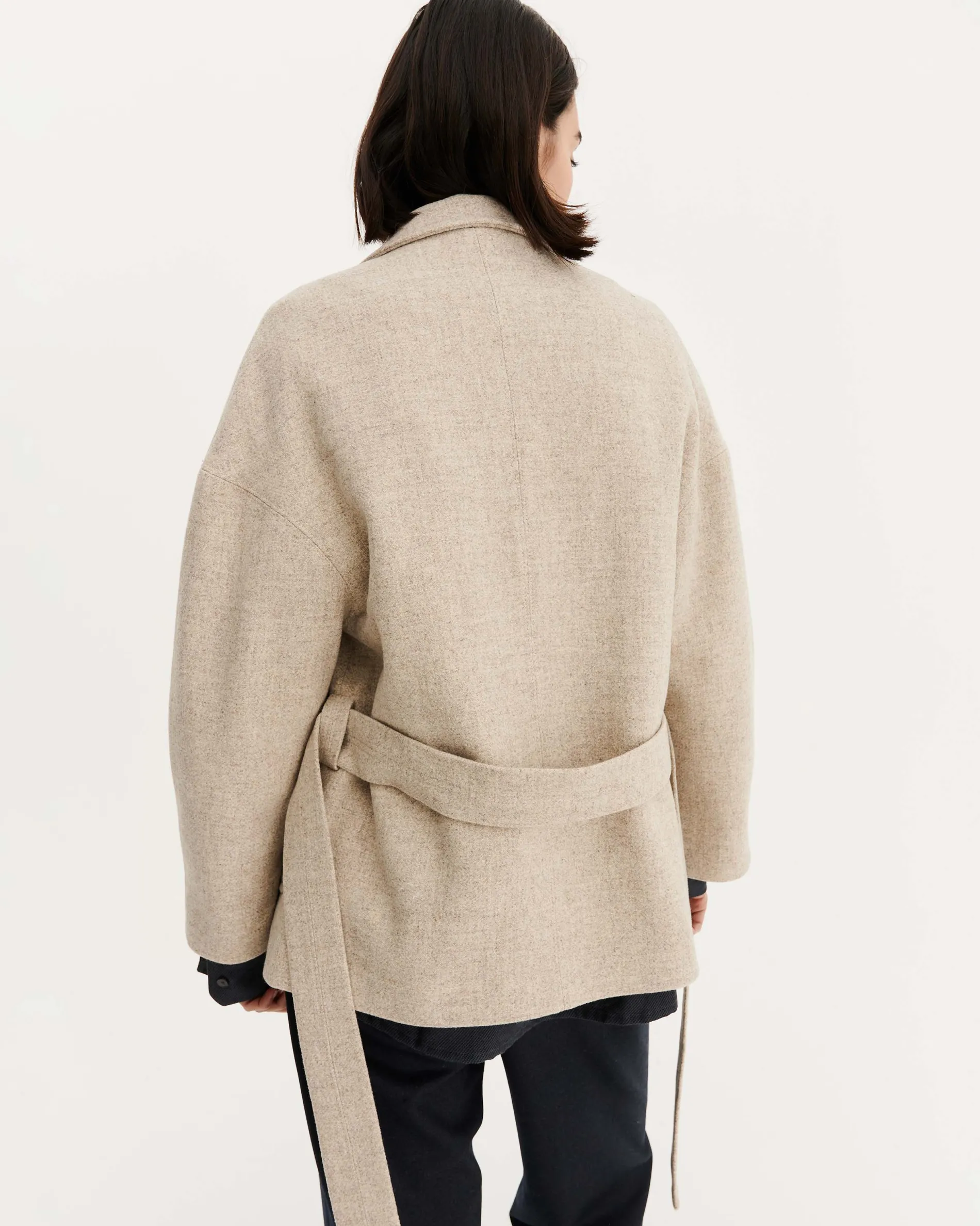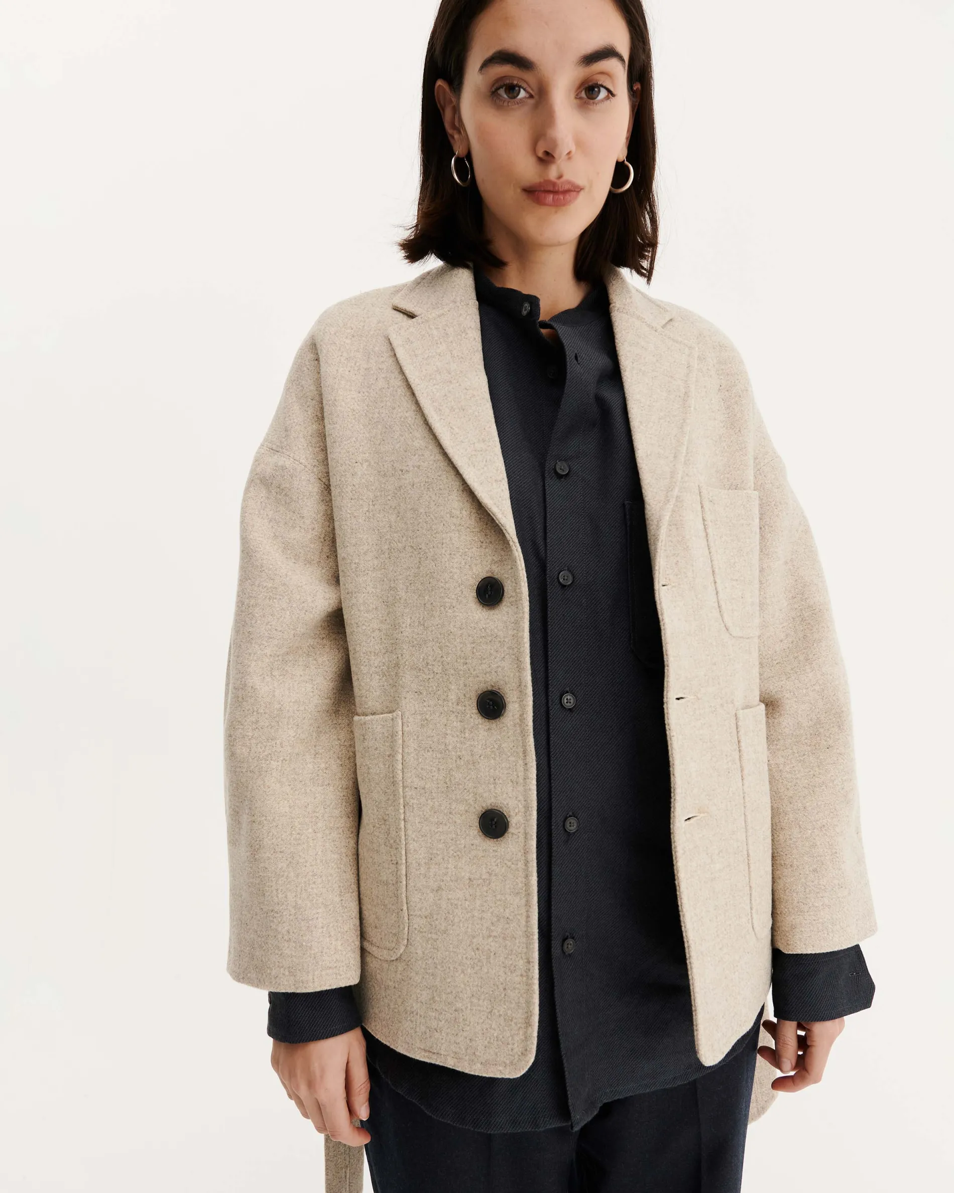 Le manteau court unisexe noyoco confection en 100% laine. Coupe ample droite et ceinture amovible pour une silhouette plus définie. Doublure intérieure en 100% coton biologique et doublure des manches en 100% viscose certifiée FSC (Forest Stewardship Council). Poche poitrine plaquée et poches avant. Boutons en bio résine. Chaque pièce du vestiaire noyoco est fabriquée en Europe, de la matière au vêtement.
