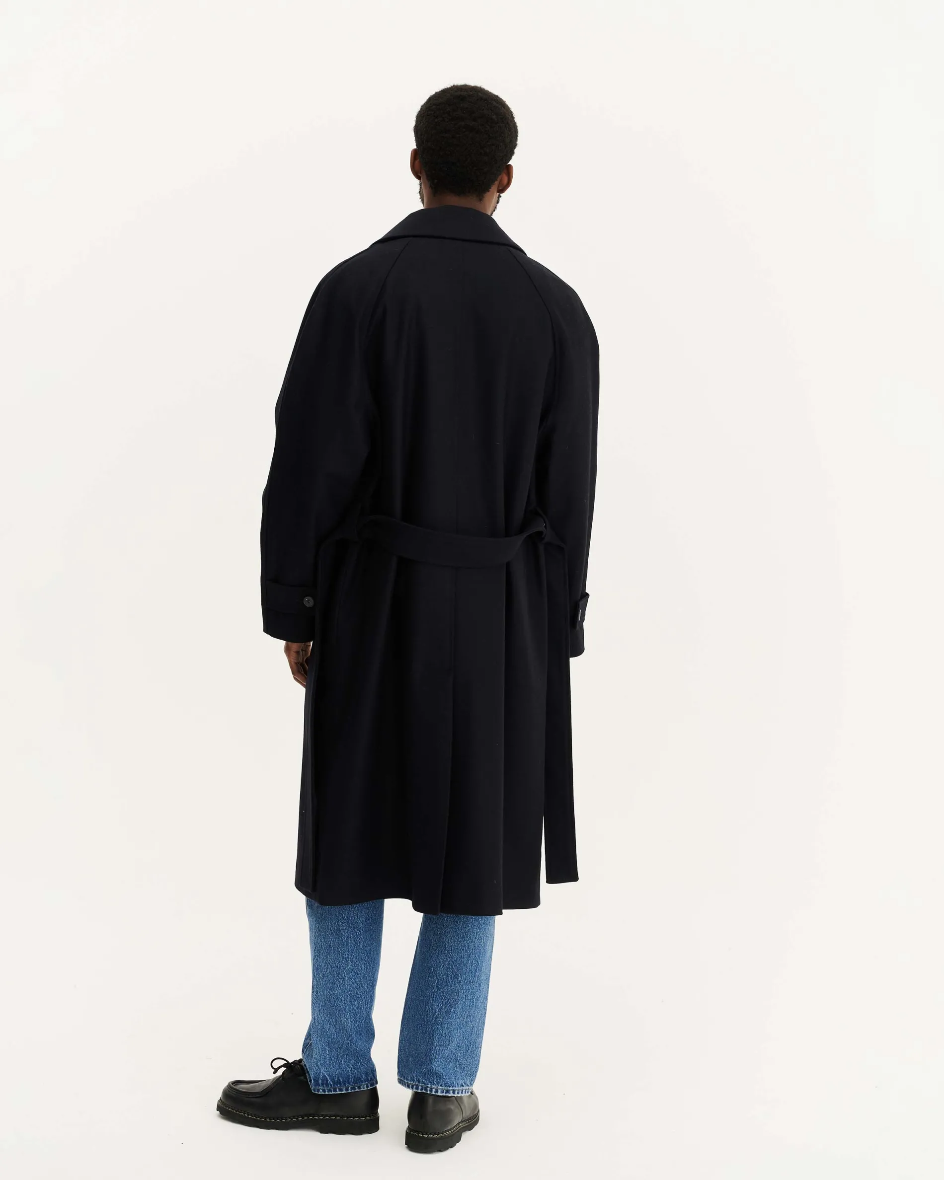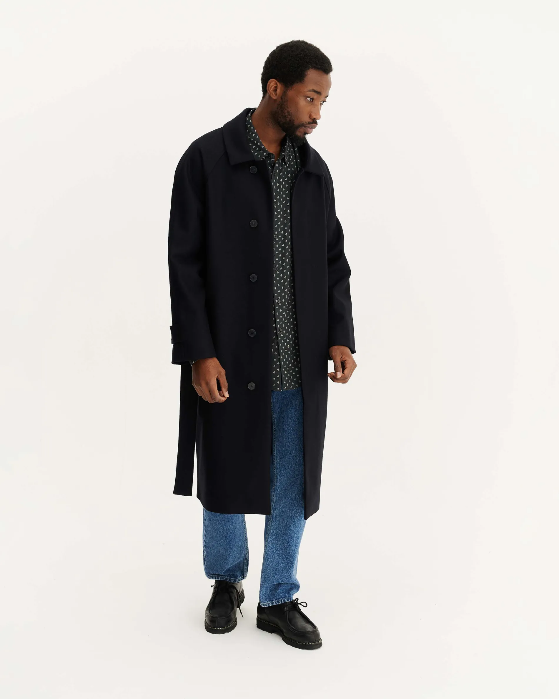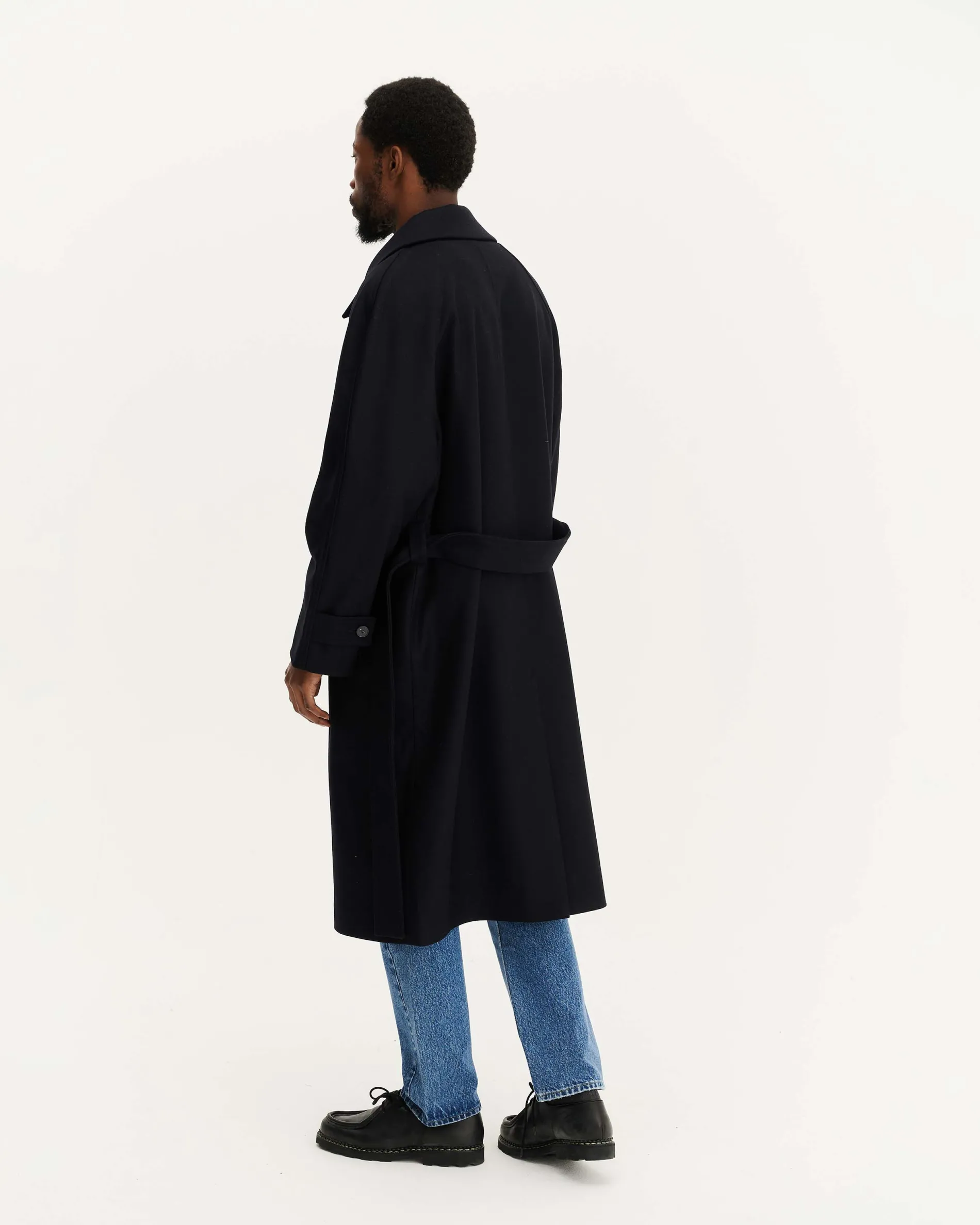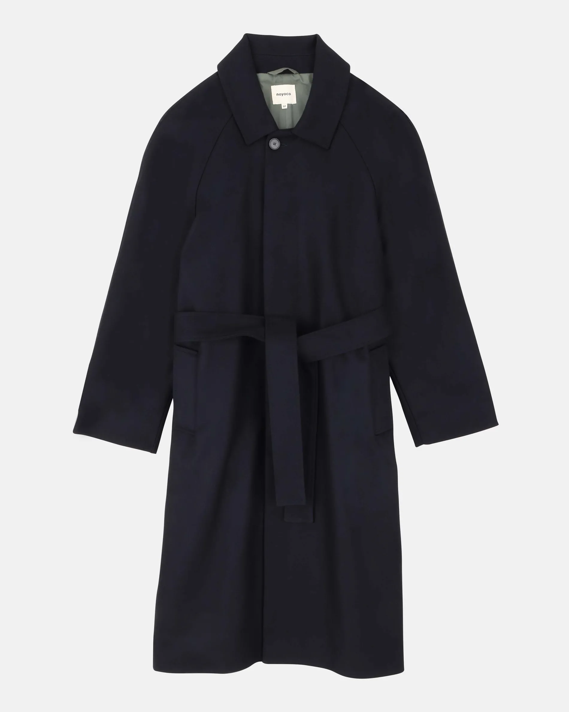 Le manteau long unisexe noyoco confectionné en laine et cachemire recyclés et certifiés GRS (Global Recycle Standard). Doublure intérieure en 100% coton biologique et doublure des manches en 100% viscose certifiée FSC (Forest Stewardship Council). Ceinture, manches et poches raglans. Boutons en ivoire végétal. Chaque pièce du vestiaire noyoco est fabriquée en Europe, de la matière au vêtement.
