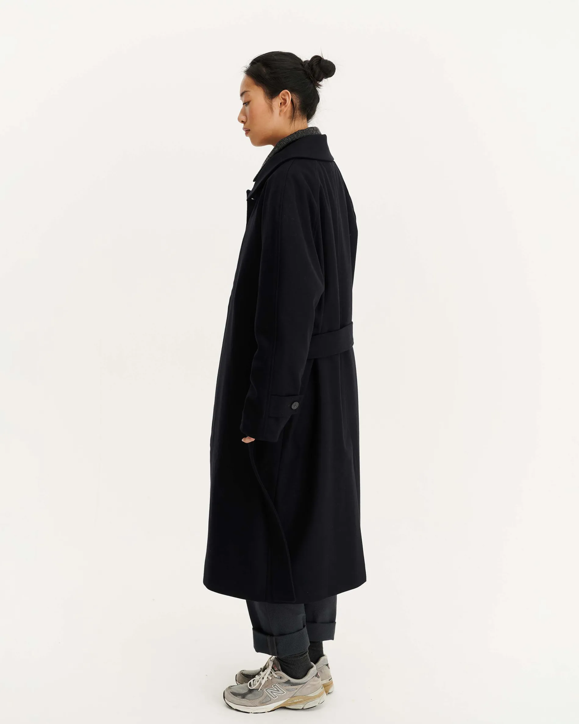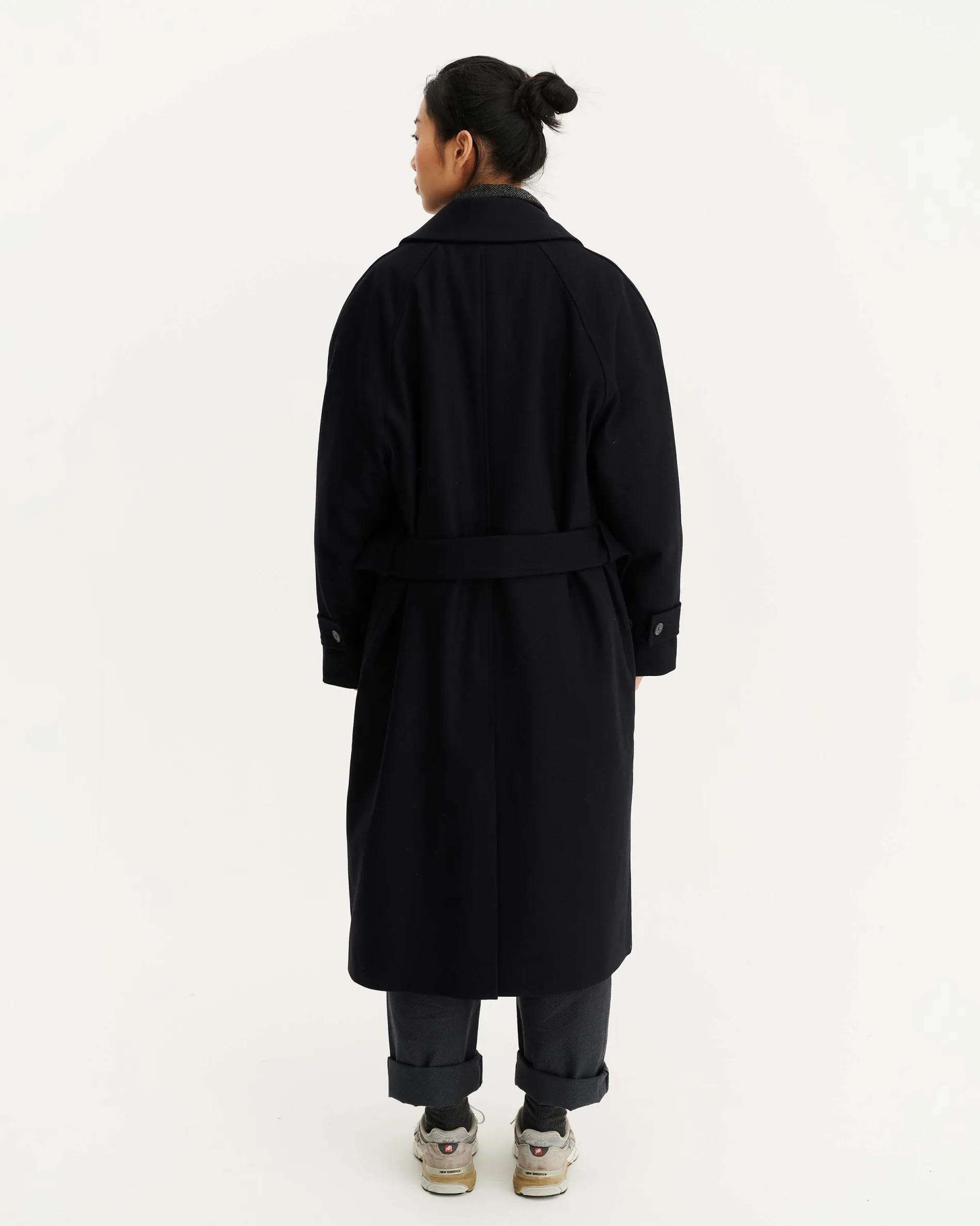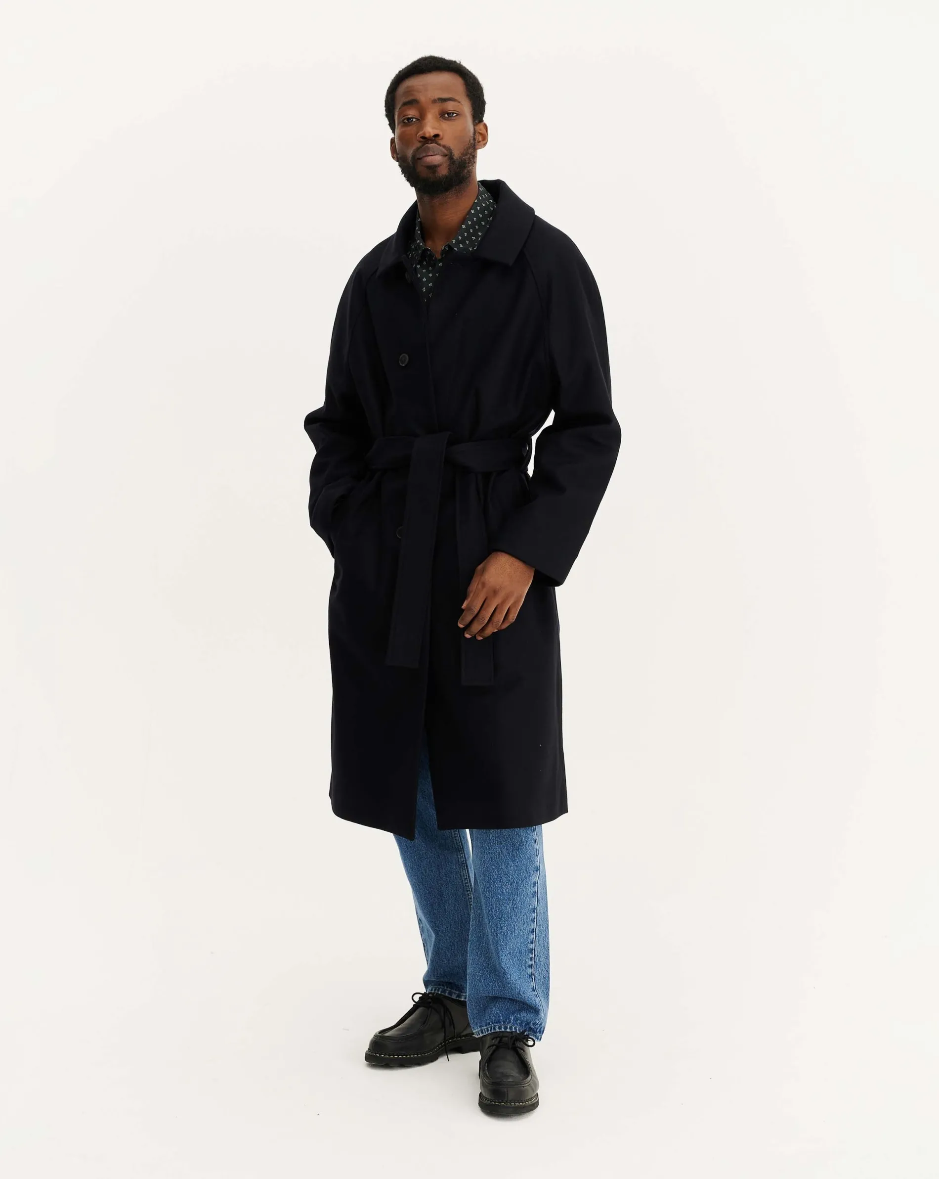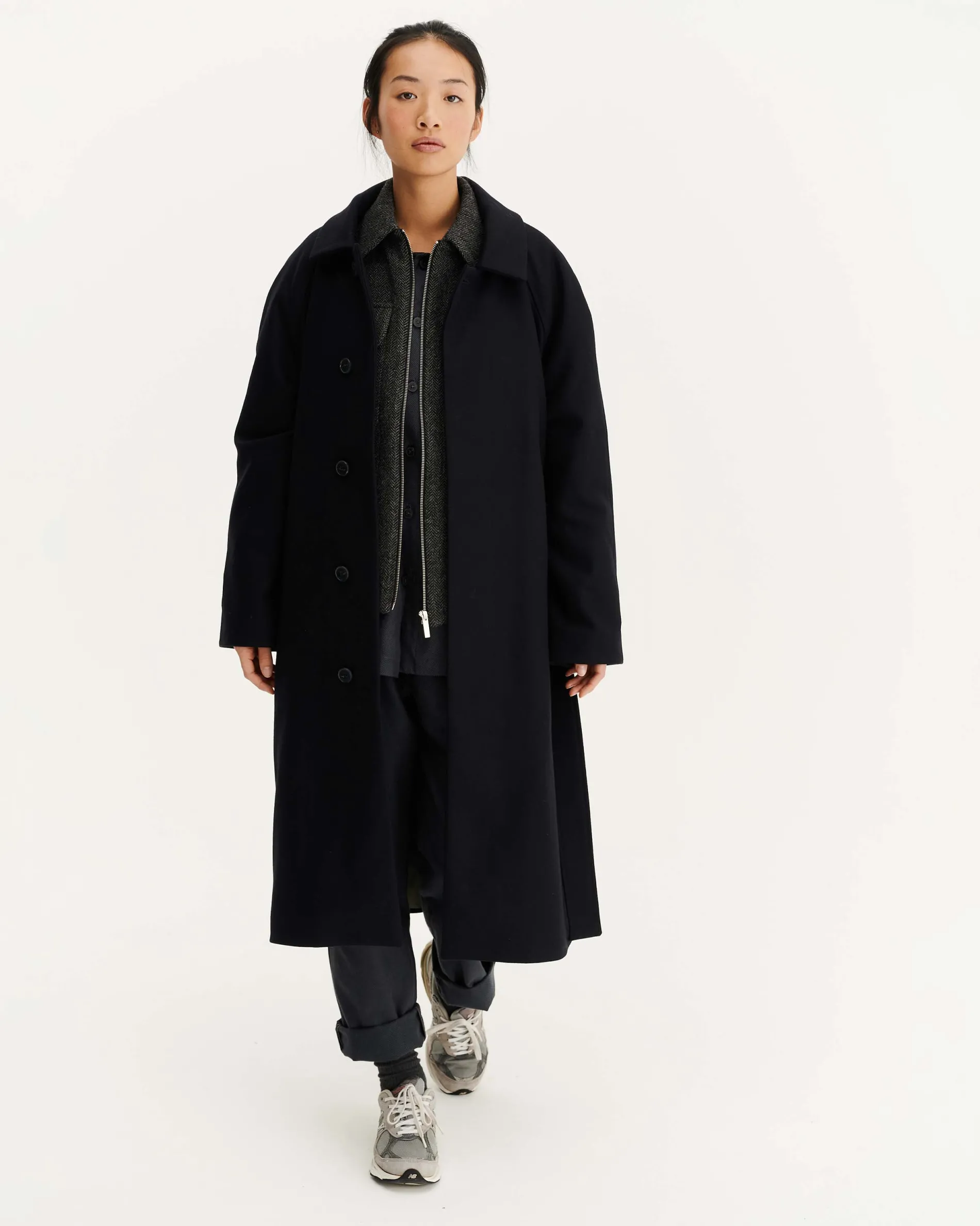 Le manteau long unisexe noyoco confectionné en laine et cachemire recyclés et certifiés GRS (Global Recycle Standard). Doublure intérieure en 100% coton biologique et doublure des manches en 100% viscose certifiée FSC (Forest Stewardship Council). Ceinture, manches et poches raglans. Boutons en ivoire végétal. Chaque pièce du vestiaire noyoco est fabriquée en Europe, de la matière au vêtement.