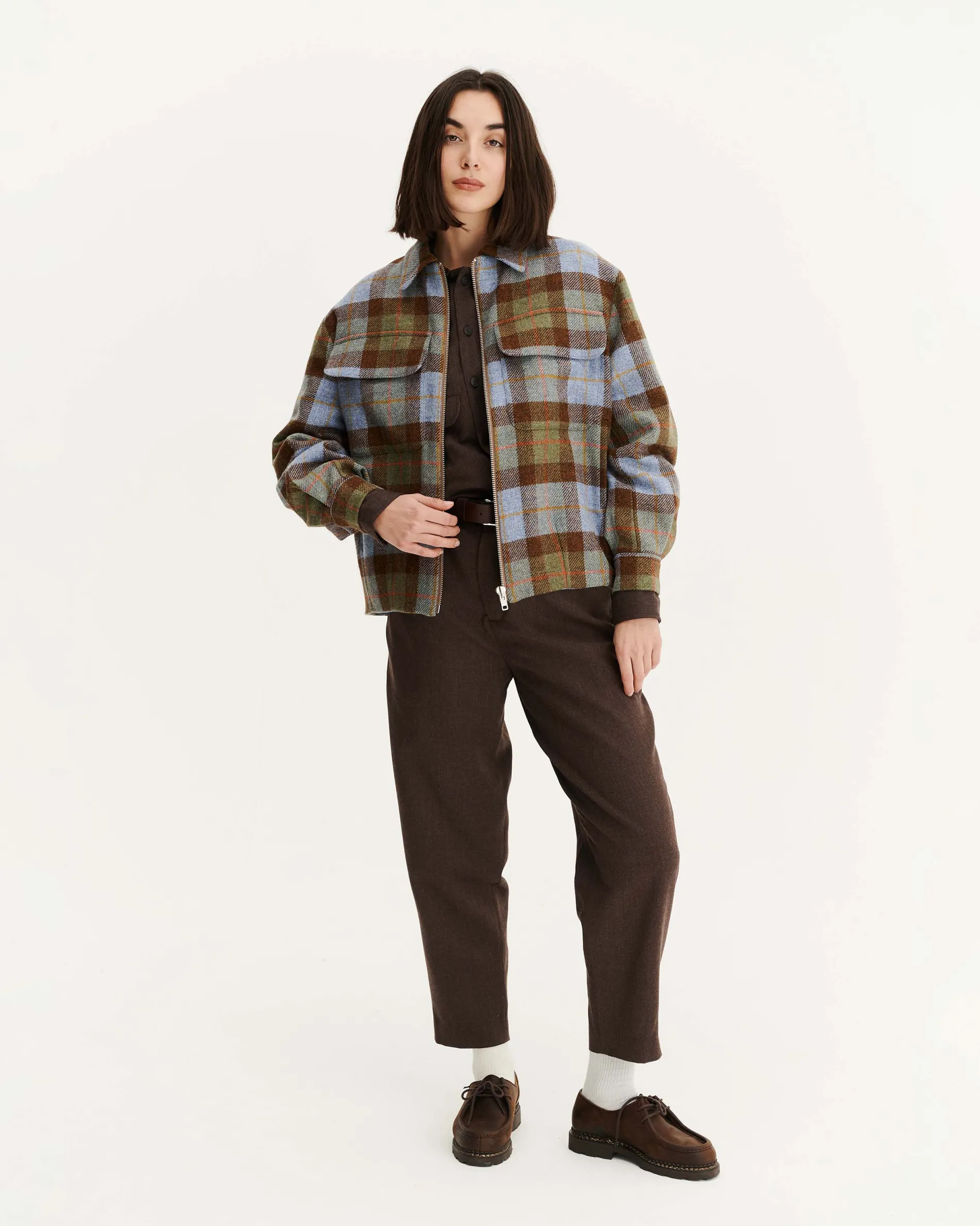 Le blouson unisexe noyoco confectionné en laine vierge provenant d’Italie. Doublure corps en 100% coton biologique certifié OCS (Organic Content Standard). Col classique, poches plaquées à rabats et des poches passepoilées verticales. Coupe droite légèrement resserrée en bas par des pinces. Fermeture zippée et poignets à boutons. Chaque pièce du vestiaire noyoco est fabriquée en Europe, de la matière au vêtement.
