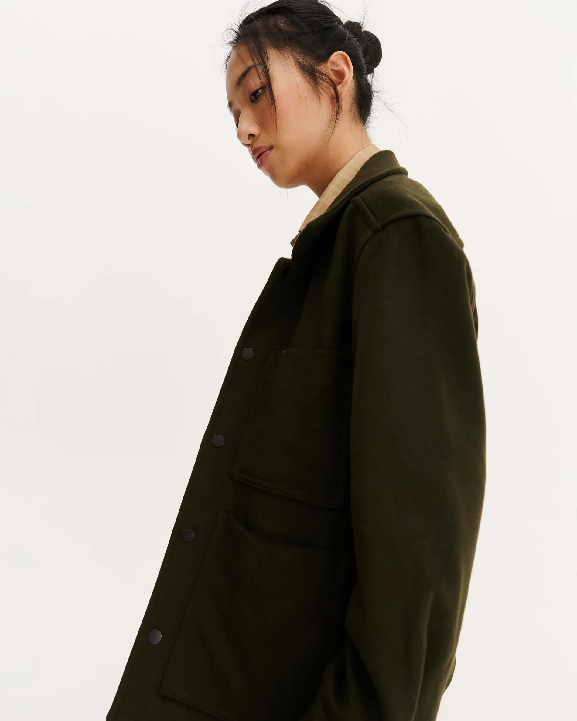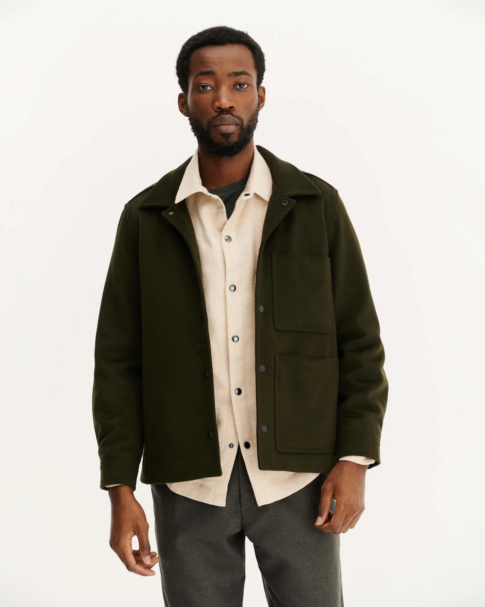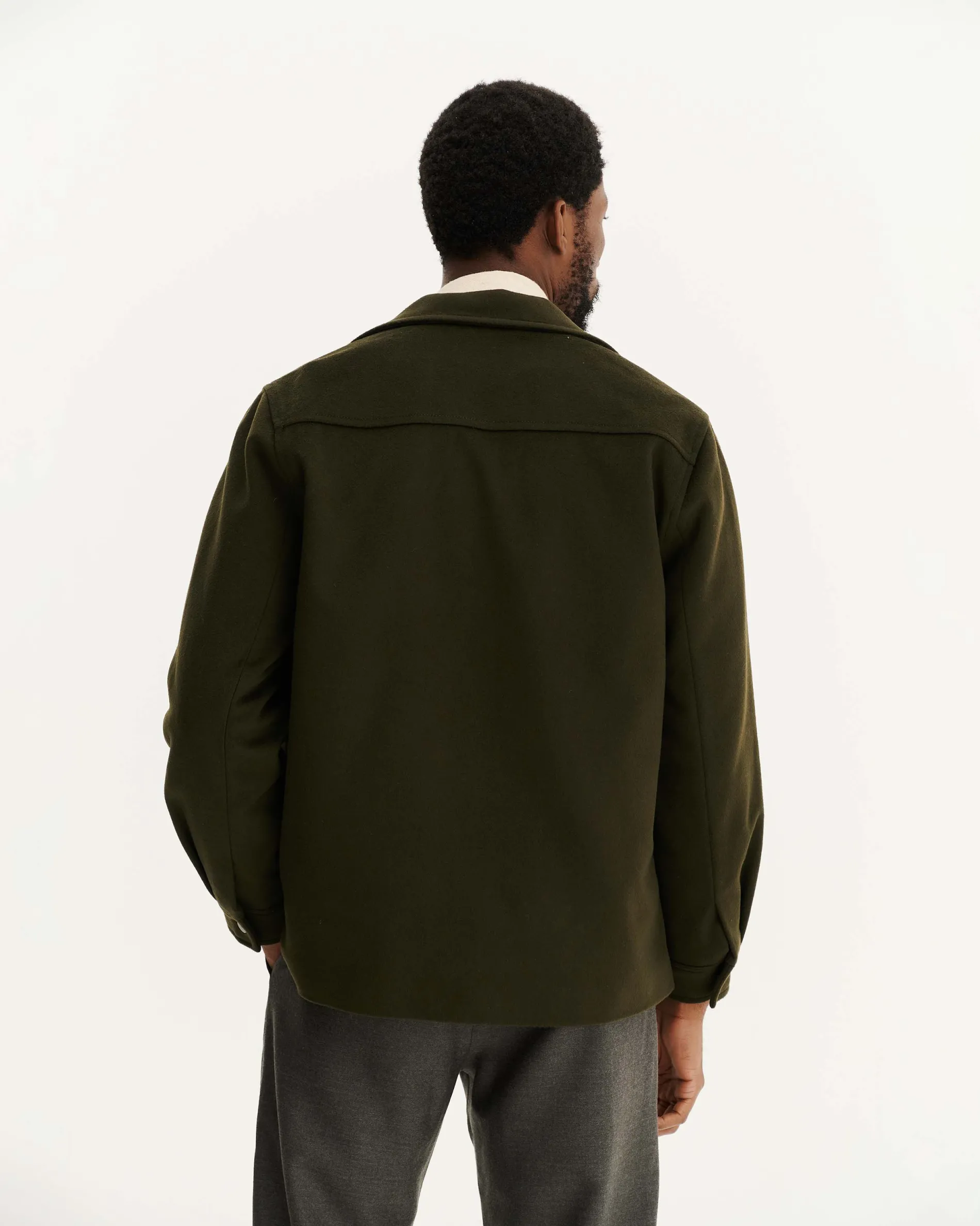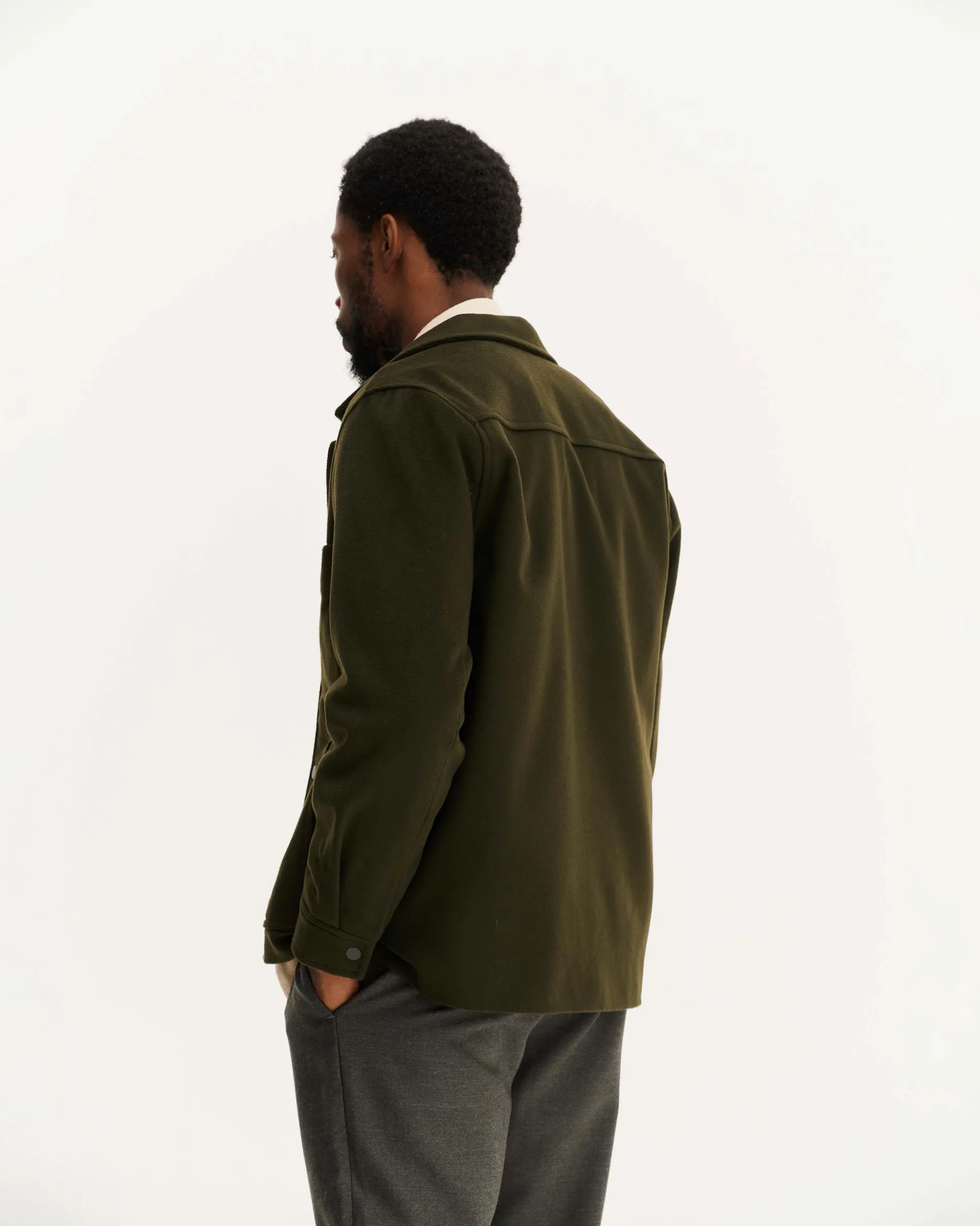 – 100% laine recyclée certifiée GRS (Global Recycle Standard)- Doublure corps : 100% coton biologique certifié OCS (Organic Content Standard)- Doublure manches : 100% viscose certifiée FSC (Forest Stewardship Council)- Coupe droite – Fermeture par boutons pression- Boutons en métal- Col classique- Deux poches plaquées avant- Poignet carré avec un bouton- Fabriquée dans nos ateliers partenaires en Roumanie
